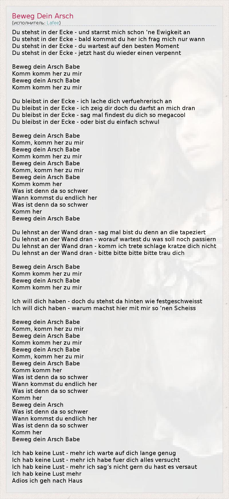 Du stehst in der Ecke - und starrst mich schon 'ne Ewigkeit an Du stehst in der Ecke - bald kommst du her ich frag mich nur wann Du stehst in der Ecke - du wartest auf den besten Moment Du stehst in der Ecke - jetzt hast du wieder einen verpennt Beweg dein Arsch Babe Komm komm her zu mir Beweg dein Arsch Babe Komm komm her zu mir Du bleibst in der Ecke - ich lache dich verfuehrerisch an Du bleibst in der Ecke - ich zeig dir doch du darfst an mich dran Du bleibst in der Ecke - sag mal findest du dich so megacool Du bleibst in der Ecke - oder bist du einfach schwul Beweg dein Arsch Babe Komm, komm her zu mir Beweg dein Arsch Babe Komm komm her zu mir Beweg dein Arsch Babe Komm, komm her zu mir Beweg dein Arsch Babe Komm komm her Was ist denn da so schwer Wann kommst du endlich her Was ist denn da so schwer Komm her Beweg dein Arsch Babe Du lehnst an der Wand dran - sag mal bist du denn an die tapeziert Du lehnst an der Wand dran - worauf wartest du was soll noch passiern Du lehnst an der Wand dran - komm ich trete schlage kratze dich nicht Du lehnst an der Wand dran - bitte bitte bitte bitte trau dich Beweg dein Arsch Babe Komm komm her zu mir Beweg dein Arsch Babe Komm komm her zu mir Ich will dich haben - doch du stehst da hinten wie festgeschweisst Ich will dich haben - warum machst hier mit mir so 'nen Scheiss Beweg dein Arsch Babe Komm, komm her zu mir Beweg dein Arsch Babe Komm komm her zu mir Beweg dein Arsch Babe Komm, komm her zu mir Beweg dein Arsch Babe Komm komm her Was ist denn da so schwer Wann kommst du endlich her Was ist denn da so schwer Komm her Beweg dein Arsch Was ist denn da so schwer Wann kommst du endlich her Was ist denn da so schwer Komm her Beweg dein Arsch Babe Ich hab keine Lust - mehr ich warte auf dich lange genug Ich hab keine Lust - mehr ich habe fuer dich alles versucht Ich hab keine Lust - mehr ich sag’s nicht gern du hast es versaut Ich hab keine Lust mehr Adios ich geh nach Haus