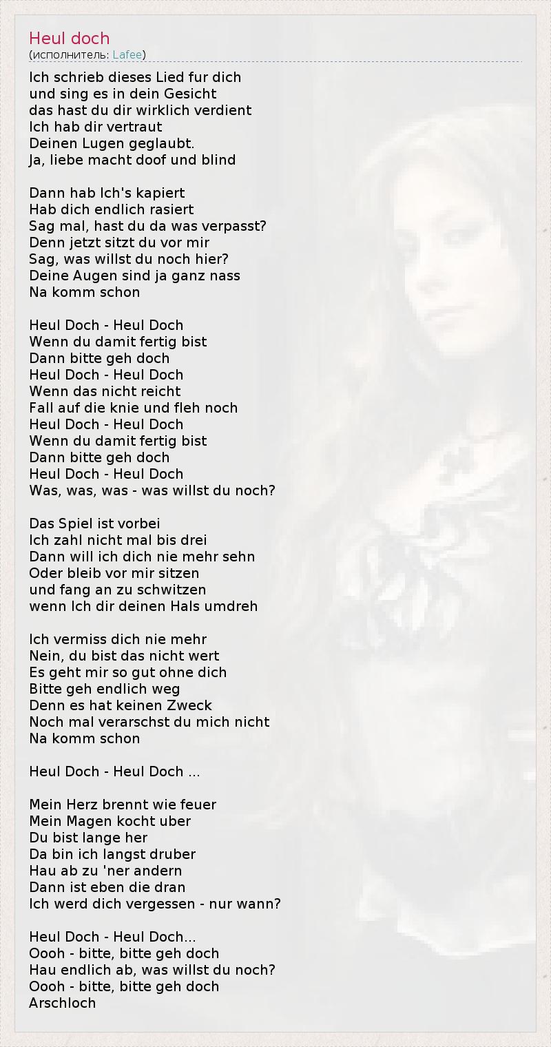 Ich schrieb dieses Lied fur dich und sing es in dein Gesicht das hast du dir wirklich verdient Ich hab dir vertraut Deinen Lugen geglaubt. Ja, liebe macht doof und blind Dann hab Ich's kapiert Hab dich endlich rasiert Sag mal, hast du da was verpasst? Denn jetzt sitzt du vor mir Sag, was willst du noch hier? Deine Augen sind ja ganz nass Na komm schon Heul Doch - Heul Doch Wenn du damit fertig bist Dann bitte geh doch Heul Doch - Heul Doch Wenn das nicht reicht Fall auf die knie und fleh noch Heul Doch - Heul Doch Wenn du damit fertig bist Dann bitte geh doch Heul Doch - Heul Doch Was, was, was - was willst du noch? Das Spiel ist vorbei Ich zahl nicht mal bis drei Dann will ich dich nie mehr sehn Oder bleib vor mir sitzen und fang an zu schwitzen wenn Ich dir deinen Hals umdreh Ich vermiss dich nie mehr Nein, du bist das nicht wert Es geht mir so gut ohne dich Bitte geh endlich weg Denn es hat keinen Zweck Noch mal verarschst du mich nicht Na komm schon Heul Doch - Heul Doch ... Mein Herz brennt wie feuer Mein Magen kocht uber Du bist lange her Da bin ich langst druber Hau ab zu 'ner andern Dann ist eben die dran Ich werd dich vergessen - nur wann? Heul Doch - Heul Doch... Oooh - bitte, bitte geh doch Hau endlich ab, was willst du noch? Oooh - bitte, bitte geh doch Arschloch