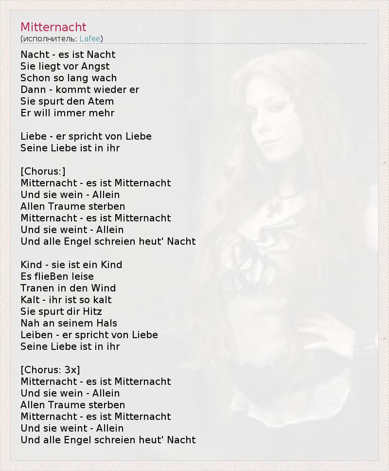 Nacht - es ist Nacht Sie liegt vor Angst Schon so lang wach Dann - kommt wieder er Sie spurt den Atem Er will immer mehr Liebe - er spricht von Liebe Seine Liebe ist in ihr [Chorus:] Mitternacht - es ist Mitternacht Und sie wein - Allein Allen Traume sterben Mitternacht - es ist Mitternacht Und sie weint - Allein Und alle Engel schreien heut' Nacht Kind - sie ist ein Kind Es flieBen leise Tranen in den Wind Kalt - ihr ist so kalt Sie spurt dir Hitz Nah an seinem Hals Leiben - er spricht von Liebe Seine Liebe ist in ihr [Chorus: 3x] Mitternacht - es ist Mitternacht Und sie wein - Allein Allen Traume sterben Mitternacht - es ist Mitternacht Und sie weint - Allein Und alle Engel schreien heut' Nacht