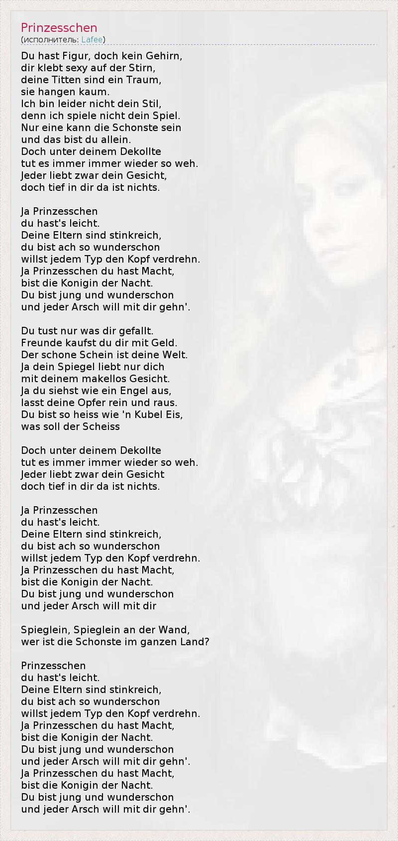 Du hast Figur, doch kein Gehirn, dir klebt sexy auf der Stirn, deine Titten sind ein Traum, sie hangen kaum. Ich bin leider nicht dein Stil, denn ich spiele nicht dein Spiel. Nur eine kann die Schonste sein und das bist du allein. Doch unter deinem Dekollte tut es immer immer wieder so weh. Jeder liebt zwar dein Gesicht, doch tief in dir da ist nichts. Ja Prinzesschen du hast's leicht. Deine Eltern sind stinkreich, du bist ach so wunderschon willst jedem Typ den Kopf verdrehn. Ja Prinzesschen du hast Macht, bist die Konigin der Nacht. Du bist jung und wunderschon und jeder Arsch will mit dir gehn'. Du tust nur was dir gefallt. Freunde kaufst du dir mit Geld. Der schone Schein ist deine Welt. Ja dein Spiegel liebt nur dich mit deinem makellos Gesicht. Ja du siehst wie ein Engel aus, lasst deine Opfer rein und raus. Du bist so heiss wie 'n Kubel Eis, was soll der Scheiss Doch unter deinem Dekollte tut es immer immer wieder so weh. Jeder liebt zwar dein Gesicht doch tief in dir da ist nichts. Ja Prinzesschen du hast's leicht. Deine Eltern sind stinkreich, du bist ach so wunderschon willst jedem Typ den Kopf verdrehn. Ja Prinzesschen du hast Macht, bist die Konigin der Nacht. Du bist jung und wunderschon und jeder Arsch will mit dir Spieglein, Spieglein an der Wand, wer ist die Schonste im ganzen Land? Prinzesschen du hast's leicht. Deine Eltern sind stinkreich, du bist ach so wunderschon willst jedem Typ den Kopf verdrehn. Ja Prinzesschen du hast Macht, bist die Konigin der Nacht. Du bist jung und wunderschon und jeder Arsch will mit dir gehn'. Ja Prinzesschen du hast Macht, bist die Konigin der Nacht. Du bist jung und wunderschon und jeder Arsch will mit dir gehn'.