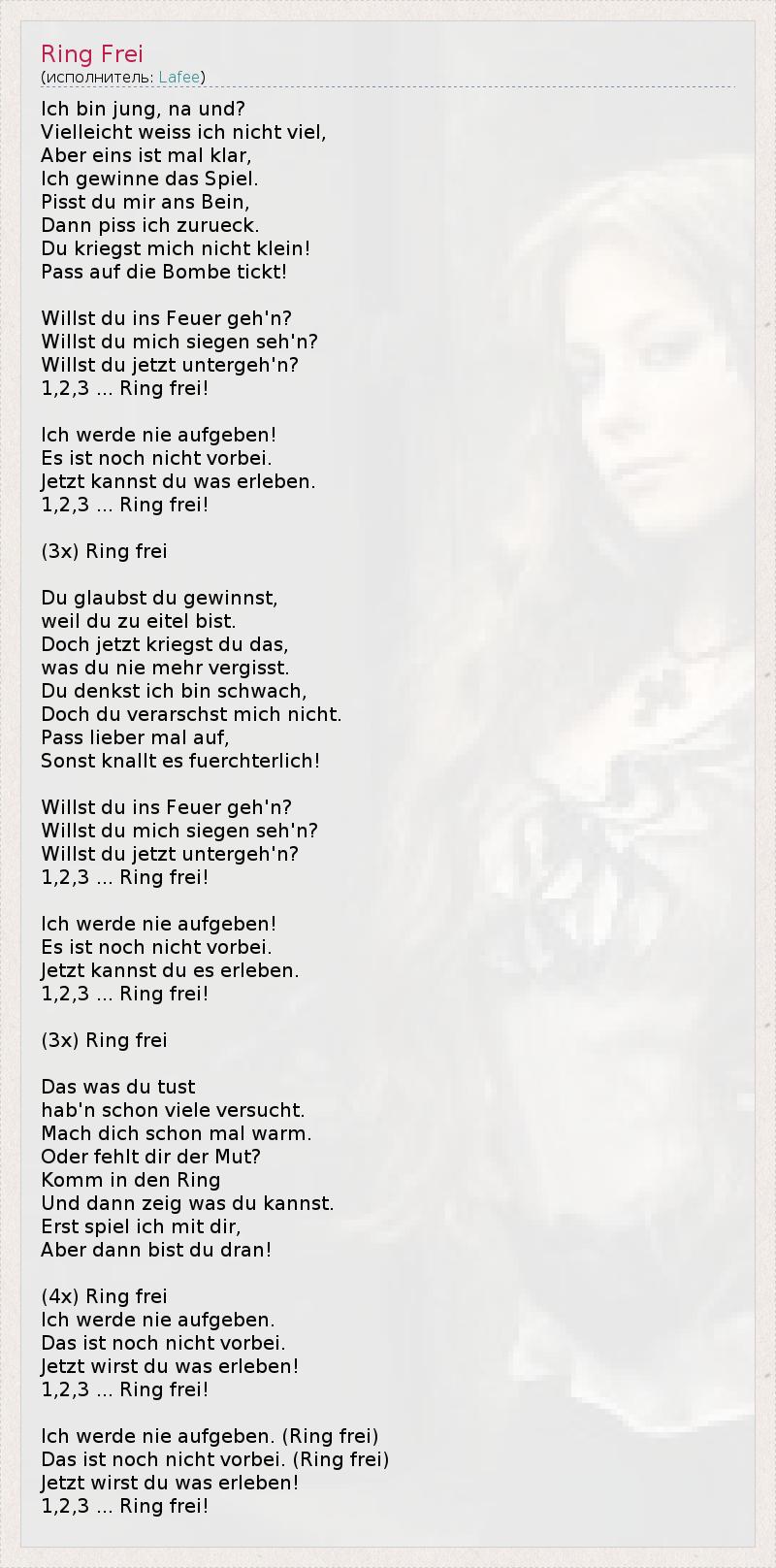Ich bin jung, na und? Vielleicht weiss ich nicht viel, Aber eins ist mal klar, Ich gewinne das Spiel. Pisst du mir ans Bein, Dann piss ich zurueck. Du kriegst mich nicht klein! Pass auf die Bombe tickt! Willst du ins Feuer geh'n? Willst du mich siegen seh'n? Willst du jetzt untergeh'n? 1,2,3 ... Ring frei! Ich werde nie aufgeben! Es ist noch nicht vorbei. Jetzt kannst du was erleben. 1,2,3 ... Ring frei! (3x) Ring frei Du glaubst du gewinnst, weil du zu eitel bist. Doch jetzt kriegst du das, was du nie mehr vergisst. Du denkst ich bin schwach, Doch du verarschst mich nicht. Pass lieber mal auf, Sonst knallt es fuerchterlich! Willst du ins Feuer geh'n? Willst du mich siegen seh'n? Willst du jetzt untergeh'n? 1,2,3 ... Ring frei! Ich werde nie aufgeben! Es ist noch nicht vorbei. Jetzt kannst du es erleben. 1,2,3 ... Ring frei! (3x) Ring frei Das was du tust hab'n schon viele versucht. Mach dich schon mal warm. Oder fehlt dir der Mut? Komm in den Ring Und dann zeig was du kannst. Erst spiel ich mit dir, Aber dann bist du dran! (4x) Ring frei Ich werde nie aufgeben. Das ist noch nicht vorbei. Jetzt wirst du was erleben! 1,2,3 ... Ring frei! Ich werde nie aufgeben. (Ring frei) Das ist noch nicht vorbei. (Ring frei) Jetzt wirst du was erleben! 1,2,3 ... Ring frei!