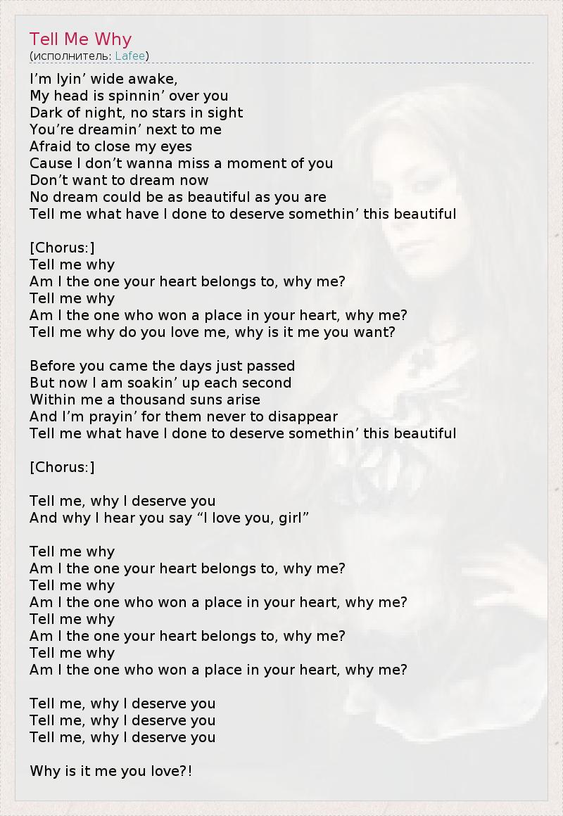 I’m lyin’ wide awake, My head is spinnin’ over you Dark of night, no stars in sight You’re dreamin’ next to me Afraid to close my eyes Cause I don’t wanna miss a moment of you Don’t want to dream now No dream could be as beautiful as you are Tell me what have I done to deserve somethin’ this beautiful [Chorus:] Tell me why Am I the one your heart belongs to, why me? Tell me why Am I the one who won a place in your heart, why me? Tell me why do you love me, why is it me you want? Before you came the days just passed But now I am soakin’ up each second Within me a thousand suns arise And I’m prayin’ for them never to disappear Tell me what have I done to deserve somethin’ this beautiful [Chorus:] Tell me, why I deserve you And why I hear you say “I love you, girl” Tell me why Am I the one your heart belongs to, why me? Tell me why Am I the one who won a place in your heart, why me? Tell me why Am I the one your heart belongs to, why me? Tell me why Am I the one who won a place in your heart, why me? Tell me, why I deserve you Tell me, why I deserve you Tell me, why I deserve you Why is it me you love?!