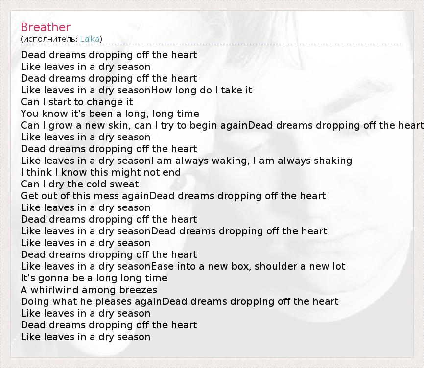 Dead dreams dropping off the heart Like leaves in a dry season Dead dreams dropping off the heart Like leaves in a dry seasonHow long do I take it Can I start to change it You know it's been a long, long time Can I grow a new skin, can I try to begin againDead dreams dropping off the heart Like leaves in a dry season Dead dreams dropping off the heart Like leaves in a dry seasonI am always waking, I am always shaking I think I know this might not end Can I dry the cold sweat Get out of this mess againDead dreams dropping off the heart Like leaves in a dry season Dead dreams dropping off the heart Like leaves in a dry seasonDead dreams dropping off the heart Like leaves in a dry season Dead dreams dropping off the heart Like leaves in a dry seasonEase into a new box, shoulder a new lot It's gonna be a long long time A whirlwind among breezes Doing what he pleases againDead dreams dropping off the heart Like leaves in a dry season Dead dreams dropping off the heart Like leaves in a dry season