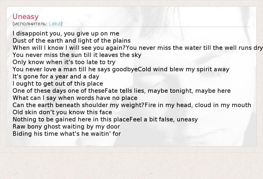 I disappoint you, you give up on me Dust of the earth and light of the plains When will I know I will see you again?You never miss the water till the well runs dry You never miss the sun till it leaves the sky Only know when it's too late to try You never love a man till he says goodbyeCold wind blew my spirit away It's gone for a year and a day I ought to get out of this place One of these days one of theseFate tells lies, maybe tonight, maybe here What can I say when words have no place Can the earth beneath shoulder my weight?Fire in my head, cloud in my mouth Old skin don't you know this face Nothing to be gained here in this placeFeel a bit false, uneasy Raw bony ghost waiting by my door Biding his time what's he waitin' for