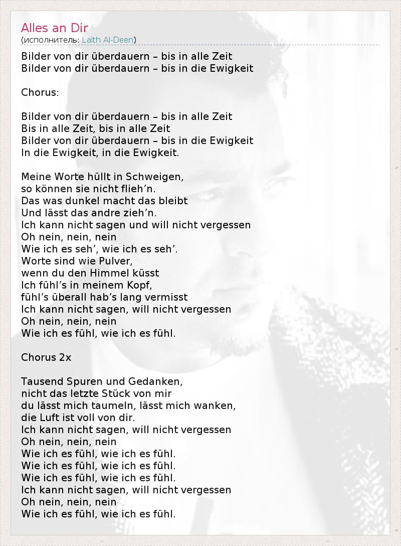 Bilder von dir überdauern – bis in alle Zeit Bilder von dir überdauern – bis in die Ewigkeit Chorus: Bilder von dir überdauern – bis in alle Zeit Bis in alle Zeit, bis in alle Zeit Bilder von dir überdauern – bis in die Ewigkeit In die Ewigkeit, in die Ewigkeit. Meine Worte hüllt in Schweigen, so können sie nicht flieh’n. Das was dunkel macht das bleibt Und lässt das andre zieh’n. Ich kann nicht sagen und will nicht vergessen Oh nein, nein, nein Wie ich es seh’, wie ich es seh’. Worte sind wie Pulver, wenn du den Himmel küsst Ich fühl’s in meinem Kopf, fühl’s überall hab’s lang vermisst Ich kann nicht sagen, will nicht vergessen Oh nein, nein, nein Wie ich es fühl, wie ich es fühl. Chorus 2x Tausend Spuren und Gedanken, nicht das letzte Stück von mir du lässt mich taumeln, lässt mich wanken, die Luft ist voll von dir. Ich kann nicht sagen, will nicht vergessen Oh nein, nein, nein Wie ich es fühl, wie ich es fühl. Wie ich es fühl, wie ich es fühl. Wie ich es fühl, wie ich es fühl. Ich kann nicht sagen, will nicht vergessen Oh nein, nein, nein Wie ich es fühl, wie ich es fühl.