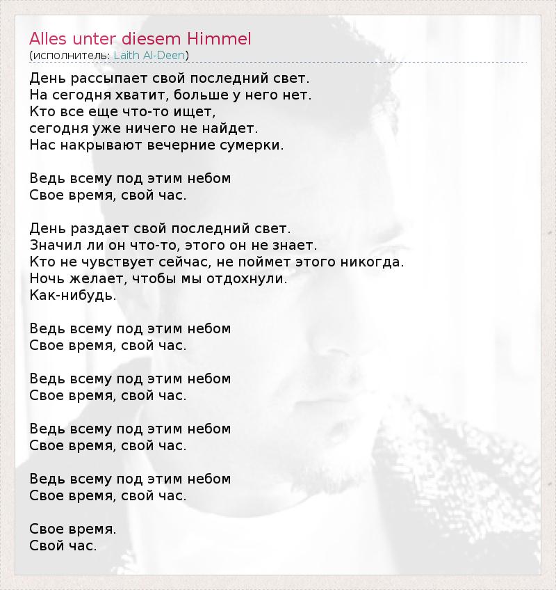 День рассыпает свой последний свет. На сегодня хватит, больше у него нет. Кто все еще что-то ищет, сегодня уже ничего не найдет. Нас накрывают вечерние сумерки. Ведь всему под этим небом Свое время, свой час. День раздает свой последний свет. Значил ли он что-то, этого он не знает. Кто не чувствует сейчас, не поймет этого никогда. Ночь желает, чтобы мы отдохнули. Как-нибудь. Ведь всему под этим небом Свое время, свой час. Ведь всему под этим небом Свое время, свой час. Ведь всему под этим небом Свое время, свой час. Ведь всему под этим небом Свое время, свой час. Свое время. Свой час.