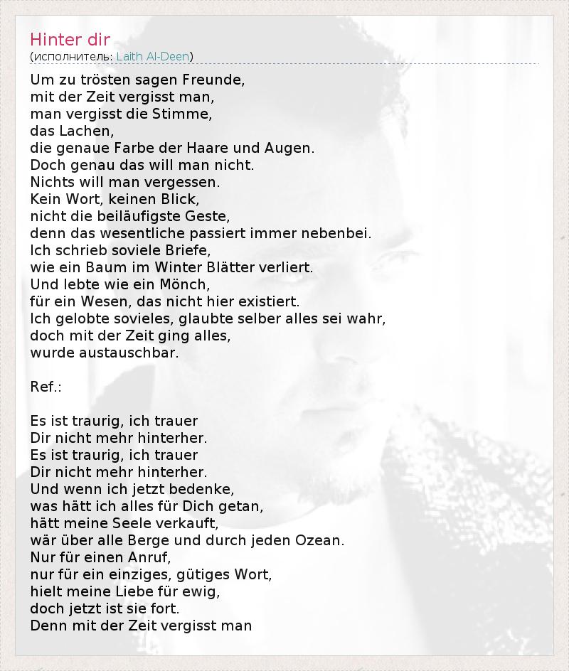 Um zu trösten sagen Freunde, mit der Zeit vergisst man, man vergisst die Stimme, das Lachen, die genaue Farbe der Haare und Augen. Doch genau das will man nicht. Nichts will man vergessen. Kein Wort, keinen Blick, nicht die beiläufigste Geste, denn das wesentliche passiert immer nebenbei. Ich schrieb soviele Briefe, wie ein Baum im Winter Blätter verliert. Und lebte wie ein Mönch, für ein Wesen, das nicht hier existiert. Ich gelobte sovieles, glaubte selber alles sei wahr, doch mit der Zeit ging alles, wurde austauschbar. Ref.: Es ist traurig, ich trauer Dir nicht mehr hinterher. Es ist traurig, ich trauer Dir nicht mehr hinterher. Und wenn ich jetzt bedenke, was hätt ich alles für Dich getan, hätt meine Seele verkauft, wär über alle Berge und durch jeden Ozean. Nur für einen Anruf, nur für ein einziges, gütiges Wort, hielt meine Liebe für ewig, doch jetzt ist sie fort. Denn mit der Zeit vergisst man