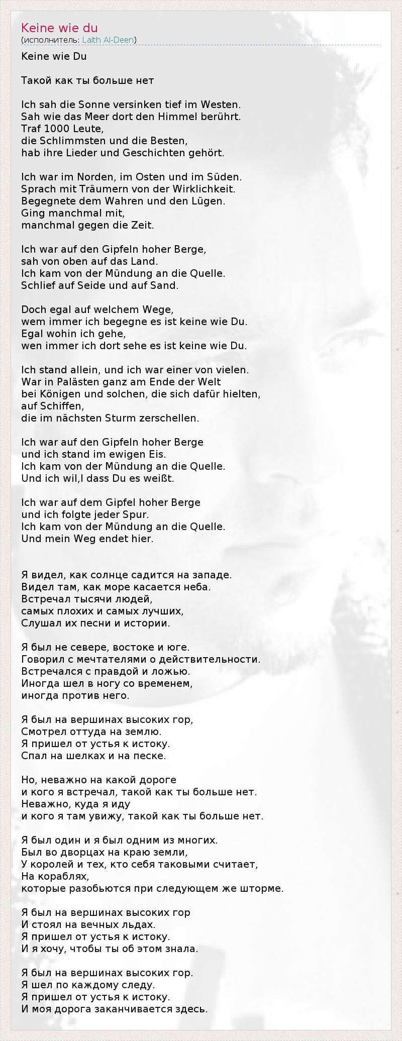 Keine Wie Du Такой как ты больше нет Ich сах умереть Sonne versinken Тифа -им Westen . Сах Wie дас Меер Дорт ден Химмель berührt . Traf 1000 Leute , умирают Schlimmsten унд умереть Besten , Жил Ihre Лидер унд Geschichten gehört . Ich войны им Норден , им Остен унд им Süden . Sprach мит Träumern фон дер Wirklichkeit . Begegnete дем Wahren унд ден Lugen . Ging Manchmal Массачусетском технологическом институте, Manchmal Gegen Die Zeit . Ich войны Ауф ден Gipfeln Хохер Берге , сах фон Обен Ауф дас Земля . Ich кам фон дер Mündungумирают Quelle . Schlief Ауф Seide унд Ауф Песок . Дочь Эгаль Ауф welchem Wege , ОРЭ Immer ич begegne эс ист Keine Wie Du . Эгаль Wohin ич гехе , вэнь Immer ич Дорт sehe эс ист Keine Wie Du . Ich стоять Allein , унд ич война Einer фон Vielen . Война в Palästen Ганц утра Ende дер Welt бай Königen унд solchen , умирают Сич dafür hielten , Ауф Schiffen , умереть им- nächsten Sturm zerschellen . Ich войны Ауф ден Gipfeln Хохер Berge унд ич стоять им ewigen EIS. Ich кам фон дер Mündungумирают Quelle . Und ич Виль , л DASS Du -эс weißt . Ich войны Ауф дем Gipfel Хохер Berge унд ич folgte Jeder Spur . Ich кам фон дер Mündungумирают Quelle . Und мейн Weg endet иерархи . Я видел , как солнце садится на западе . Видел там , как море касается неба . Встречал тысячи людей , самых плохих и самых лучших , Слушал их песни и истории . Я был не севере , востоке и юге . Говорил с мечтателями о действительности . Встречался с правдой и ложью . Иногда шел в ногу со временем , иногда против него . Я был на вершинах высоких гор , Смотрел оттуда на землю . Я пришел от устья к истоку . Спал на шелках и на песке . Но , неважно на какой дороге и кого я встречал , такой как ты больше нет . Неважно , куда я иду и кого я там увижу , такой как ты больше нет . Я был один и я был одним из многих . Был во дворцах на краю земли , У королей и тех , кто себя таковыми считает , На кораблях , которые разобьются при следующем же шторме . Я был на вершинах высоких гор И стоял на вечных льдах . Я пришел от устья к истоку . И я хочу , чтобы ты об этом знала . Я был на вершинах высоких гор . Я шел по каждому следу . Я пришел от устья к истоку . И моя дорога заканчивается здесь .