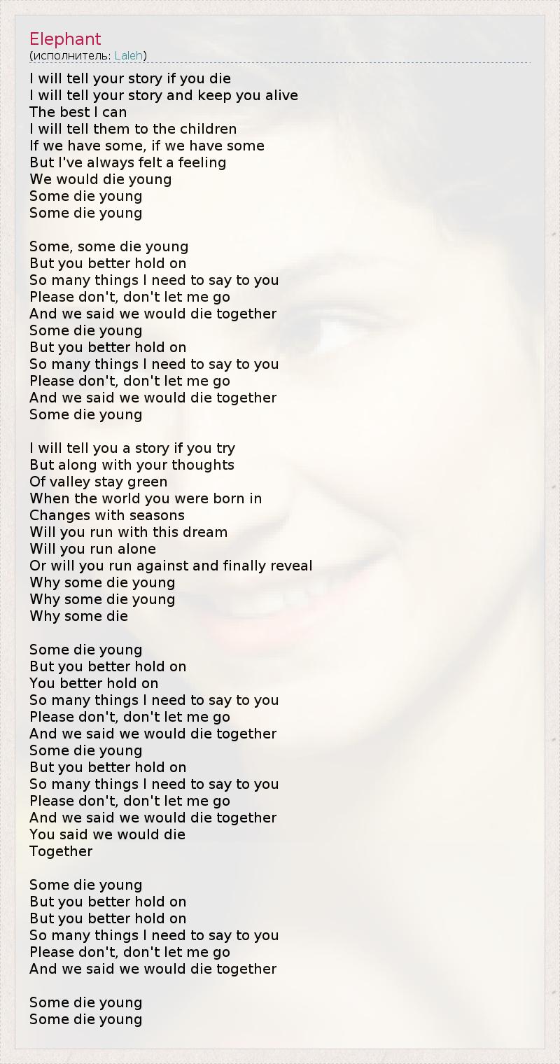Я расскажу твою историю, если умрёшь, Расскажу твою историю и сделаю всё, что смогу, Чтобы тебя не забыли 1. Расскажу истории детям, Если они у нас будут, если будут. Но у меня всегда было чувство, Что мы умрём молодыми. Некоторые уходят юными... Люди умирают молодыми... Некоторые, некоторые умирают молодыми, Но ты не сдавайся. Мне ещё о стольком нужно тебе рассказать, Прошу, не покидай, не оставляй меня, Ведь мы собирались умереть вместе. Некоторые умирают молодыми, Но ты не сдавайся. Мне ещё о стольком нужно тебе рассказать, Прошу, не покидай, не оставляй меня, Ведь мы собирались умереть вместе. Некоторые умирают молодыми. Если будешь бороться, я расскажу тебе историю, Но если в мире, где ты был рождён, Времена года сменяются, В то время как все твои помыслы связаны С вечнозелёной долиной - Будешь ли ты и дальше следовать за своей мечтой Или же продолжишь двигаться один? Или ты столкнёшься с ней и наконец-то выяснишь, Почему некоторые уходят юными? Почему люди умирают молодыми, Почему некоторые уходят... Некоторые умирают молодыми, Но ты не сдавайся, Борись. Мне ещё о стольком нужно тебе рассказать, Прошу, не покидай, не оставляй меня, Ведь мы собирались умереть вместе. Некоторые, некоторые умирают молодыми, Но ты не сдавайся. Мне ещё о стольком нужно тебе рассказать, Прошу, не покидай, не оставляй меня, Ведь мы собирались умереть вместе. Ты говорил, что мы умрём Вместе. Некоторые умирают молодыми, Но ты не сдавайся, Борись. Мне ещё о стольком нужно тебе рассказать, Прошу, не покидай, не оставляй меня, Ведь мы собирались умереть вместе. Некоторые уходят юными... Люди умирают молодыми... 1 – дословно, "чтобы сохранить тебе жизнь".