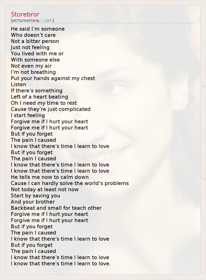 He said I’m someone Who doesn’t care Not a bitter person Just not feeling You lived with me or With someone else Not even my air I’m not breathing Put your hands against my chest Listen If there’s something Left of a heart beating Oh I need my time to rest Cause they’re just complicated I start feeling Forgive me if I hurt your heart Forgive me if I hurt your heart But if you forget The pain I caused I know that there’s time I learn to love But if you forget The pain I caused I know that there’s time I learn to love I know that there’s time I learn to love He tells me now to calm down Cause I can hardly solve the world's problems Not today at least not now Start by saving you And your brother Backbeat and small for teach other Forgive me if I hurt your heart Forgive me if I hurt your heart But if you forget The pain I caused I know that there’s time I learn to love But if you forget The pain I caused I know that there’s time I learn to love I know that there’s time I learn to love.