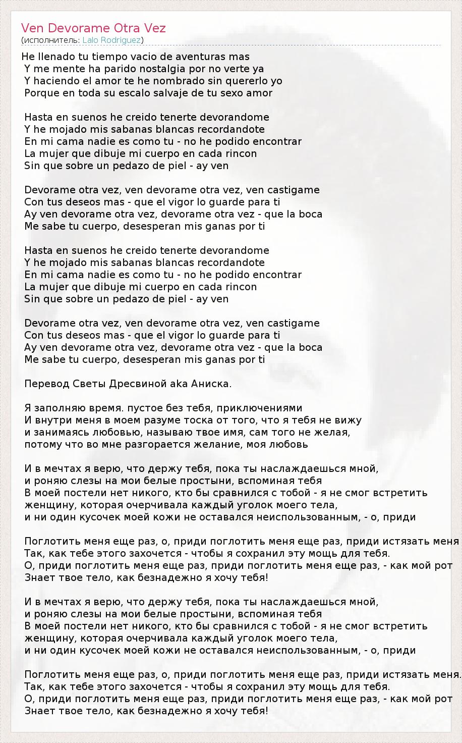 He llenado tu tiempo vacio de aventuras mas Y me mente ha parido nostalgia por no verte ya Y haciendo el amor te he nombrado sin quererlo yo Porque en toda su escalo salvaje de tu sexo amor Hasta en suenos he creido tenerte devorandome Y he mojado mis sabanas blancas recordandote En mi cama nadie es como tu - no he podido encontrar La mujer que dibuje mi cuerpo en cada rincon Sin que sobre un pedazo de piel - ay ven Devorame otra vez, ven devorame otra vez, ven castigame Con tus deseos mas - que el vigor lo guarde para ti Ay ven devorame otra vez, devorame otra vez - que la boca Me sabe tu cuerpo, desesperan mis ganas por ti Hasta en suenos he creido tenerte devorandome Y he mojado mis sabanas blancas recordandote En mi cama nadie es como tu - no he podido encontrar La mujer que dibuje mi cuerpo en cada rincon Sin que sobre un pedazo de piel - ay ven Devorame otra vez, ven devorame otra vez, ven castigame Con tus deseos mas - que el vigor lo guarde para ti Ay ven devorame otra vez, devorame otra vez - que la boca Me sabe tu cuerpo, desesperan mis ganas por ti Перевод Светы Дресвиной aka Аниска. Я заполняю время. пустое без тебя, приключениями И внутри меня в моем разуме тоска от того, что я тебя не вижу и занимаясь любовью, называю твое имя, сам того не желая, потому что во мне разгорается желание, моя любовь И в мечтах я верю, что держу тебя, пока ты наслаждаешься мной, и роняю слезы на мои белые простыни, вспоминая тебя В моей постели нет никого, кто бы сравнился с тобой - я не смог встретить женщину, которая очерчивала каждый уголок моего тела, и ни один кусочек моей кожи не оставался неиспользованным, - о, приди Поглотить меня еще раз, о, приди поглотить меня еще раз, приди истязать меня Так, как тебе этого захочется - чтобы я сохранил эту мощь для тебя. О, приди поглотить меня еще раз, приди поглотить меня еще раз, - как мой рот Знает твое тело, как безнадежно я хочу тебя! И в мечтах я верю, что держу тебя, пока ты наслаждаешься мной, и роняю слезы на мои белые простыни, вспоминая тебя В моей постели нет никого, кто бы сравнился с тобой - я не смог встретить женщину, которая очерчивала каждый уголок моего тела, и ни один кусочек моей кожи не оставался неиспользованным, - о, приди Поглотить меня еще раз, о, приди поглотить меня еще раз, приди истязать меня. Так, как тебе этого захочется - чтобы я сохранил эту мощь для тебя. О, приди поглотить меня еще раз, приди поглотить меня еще раз, - как мой рот Знает твое тело, как безнадежно я хочу тебя!