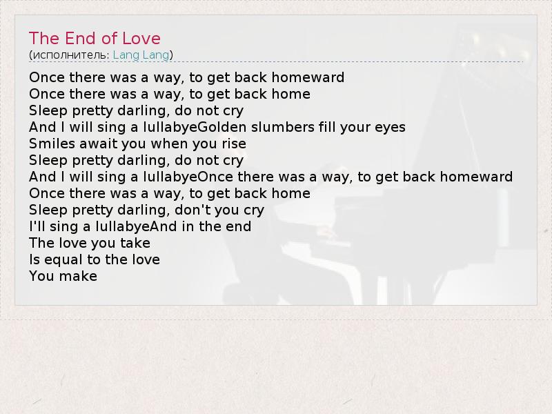 Once there was a way, to get back homeward Once there was a way, to get back home Sleep pretty darling, do not cry And I will sing a lullabyeGolden slumbers fill your eyes Smiles await you when you rise Sleep pretty darling, do not cry And I will sing a lullabyeOnce there was a way, to get back homeward Once there was a way, to get back home Sleep pretty darling, don't you cry I'll sing a lullabyeAnd in the end The love you take Is equal to the love You make