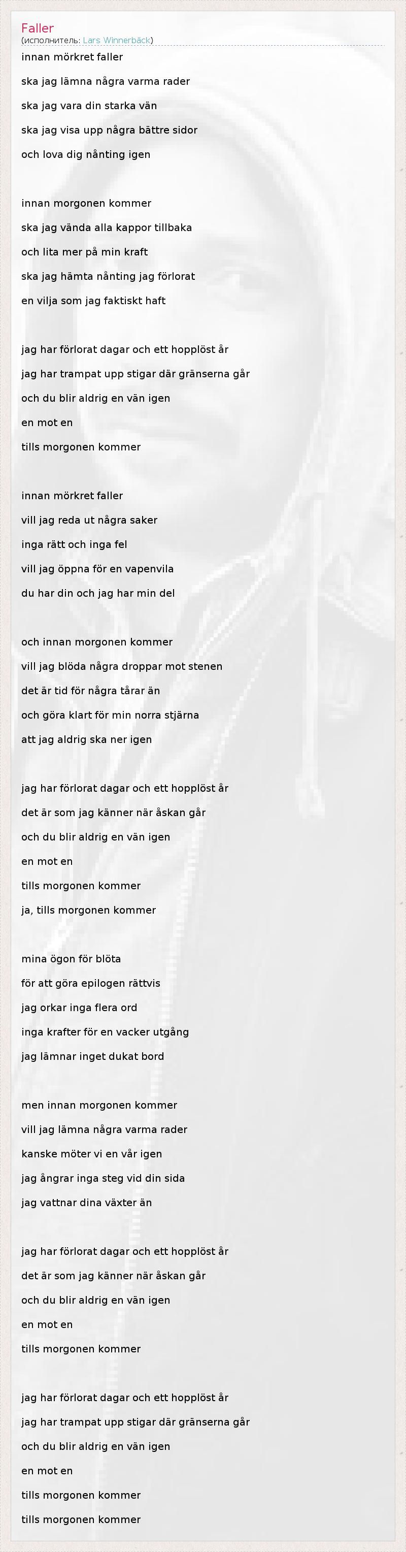 innan mörkret faller ska jag lämna några varma rader ska jag vara din starka vän ska jag visa upp några bättre sidor och lova dig nånting igen innan morgonen kommer ska jag vända alla kappor tillbaka och lita mer på min kraft ska jag hämta nånting jag förlorat en vilja som jag faktiskt haft jag har förlorat dagar och ett hopplöst år jag har trampat upp stigar där gränserna går och du blir aldrig en vän igen en mot en tills morgonen kommer innan mörkret faller vill jag reda ut några saker inga rätt och inga fel vill jag öppna för en vapenvila du har din och jag har min del och innan morgonen kommer vill jag blöda några droppar mot stenen det är tid för några tårar än och göra klart för min norra stjärna att jag aldrig ska ner igen jag har förlorat dagar och ett hopplöst år det är som jag känner när åskan går och du blir aldrig en vän igen en mot en tills morgonen kommer ja, tills morgonen kommer mina ögon för blöta för att göra epilogen rättvis jag orkar inga flera ord inga krafter för en vacker utgång jag lämnar inget dukat bord men innan morgonen kommer vill jag lämna några varma rader kanske möter vi en vår igen jag ångrar inga steg vid din sida jag vattnar dina växter än jag har förlorat dagar och ett hopplöst år det är som jag känner när åskan går och du blir aldrig en vän igen en mot en tills morgonen kommer jag har förlorat dagar och ett hopplöst år jag har trampat upp stigar där gränserna går och du blir aldrig en vän igen en mot en tills morgonen kommer tills morgonen kommer