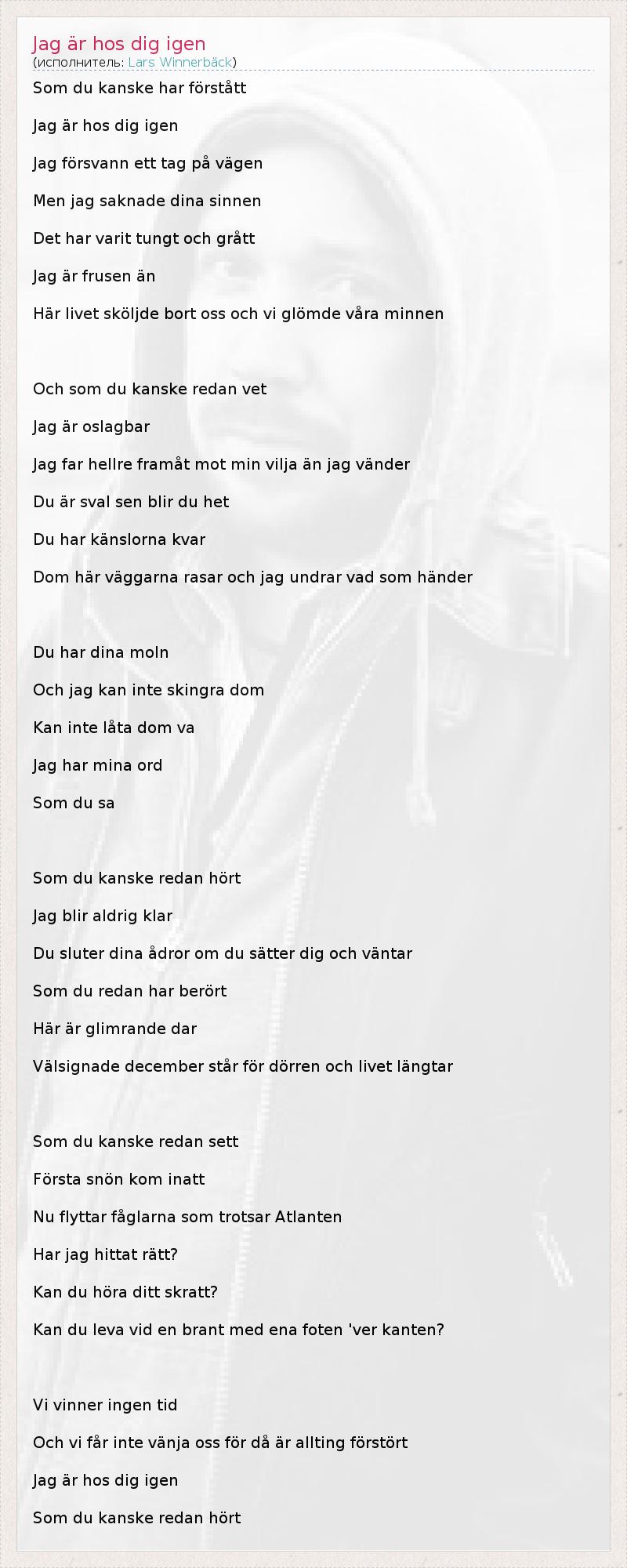 Это интересно:Lars Winnerbäck — один из самых популярных шведских singers/songwriters последней декады. Оттолкнувшись от звука поп-фолка, Ларс приблизился року поздних 90-х. В своей самой недавней работе Ларс снова вернулся к акустическому звучанию. Родившись в городе Linköping, Ларс уехал в Стокгольм, где и достиг успеха в музыкальной карьере. Оба города часто отражаются в текстах его песен.