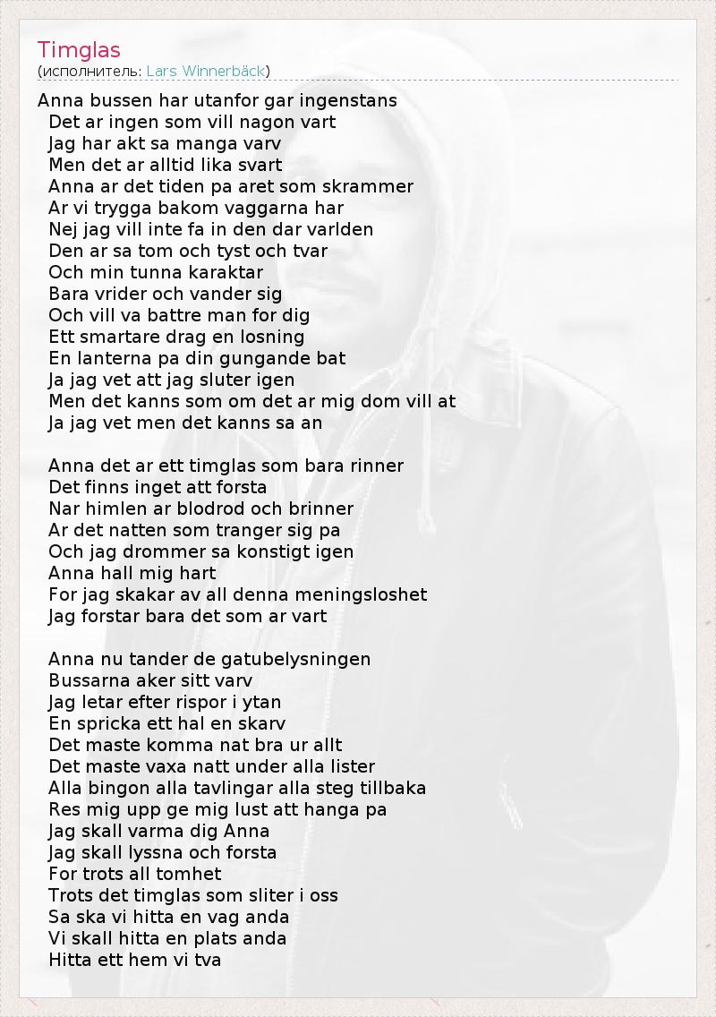 Это интересно:Lars Winnerbäck — один из самых популярных шведских singers/songwriters последней декады. Оттолкнувшись от звука поп-фолка, Ларс приблизился року поздних 90-х. В своей самой недавней работе Ларс снова вернулся к акустическому звучанию. Родившись в городе Linköping, Ларс уехал в Стокгольм, где и достиг успеха в музыкальной карьере. Оба города часто отражаются в текстах его песен.