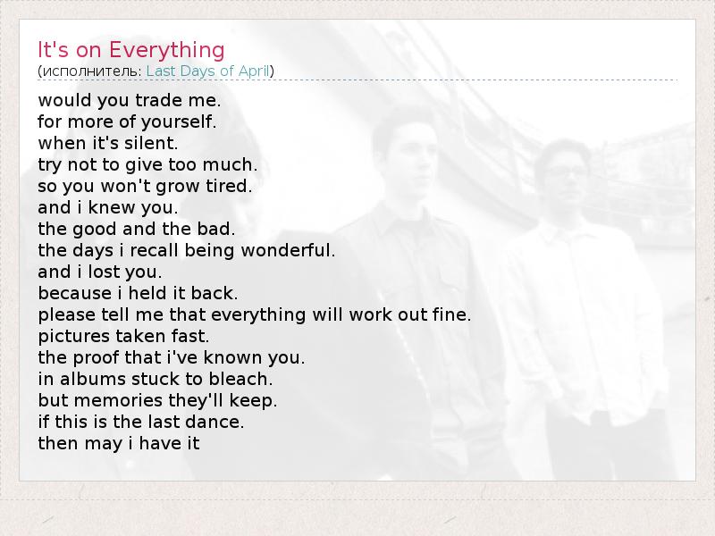 would you trade me. for more of yourself. when it's silent. try not to give too much. so you won't grow tired. and i knew you. the good and the bad. the days i recall being wonderful. and i lost you. because i held it back. please tell me that everything will work out fine. pictures taken fast. the proof that i've known you. in albums stuck to bleach. but memories they'll keep. if this is the last dance. then may i have it