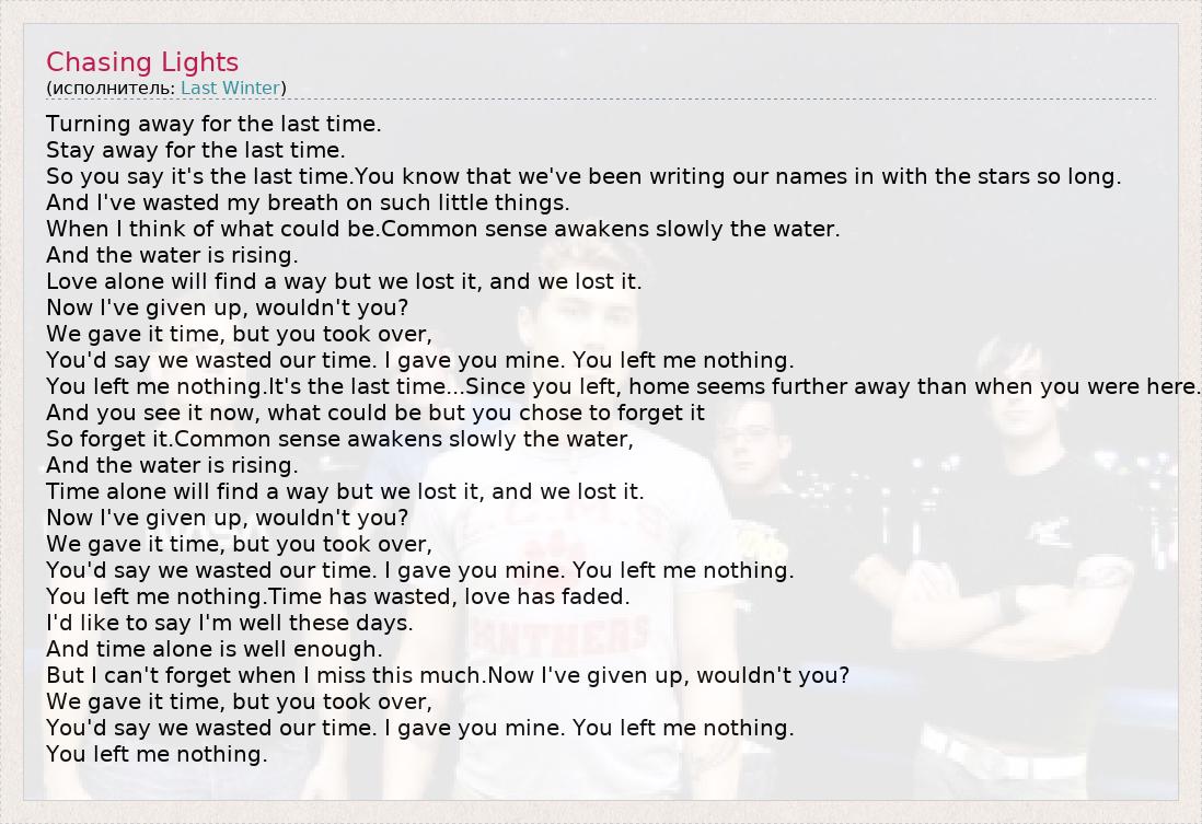 Turning away for the last time. Stay away for the last time. So you say it's the last time.You know that we've been writing our names in with the stars so long. And I've wasted my breath on such little things. When I think of what could be.Common sense awakens slowly the water. And the water is rising. Love alone will find a way but we lost it, and we lost it. Now I've given up, wouldn't you? We gave it time, but you took over, You'd say we wasted our time. I gave you mine. You left me nothing. You left me nothing.It's the last time...Since you left, home seems further away than when you were here. And you see it now, what could be but you chose to forget it So forget it.Common sense awakens slowly the water, And the water is rising. Time alone will find a way but we lost it, and we lost it. Now I've given up, wouldn't you? We gave it time, but you took over, You'd say we wasted our time. I gave you mine. You left me nothing. You left me nothing.Time has wasted, love has faded. I'd like to say I'm well these days. And time alone is well enough. But I can't forget when I miss this much.Now I've given up, wouldn't you? We gave it time, but you took over, You'd say we wasted our time. I gave you mine. You left me nothing. You left me nothing.