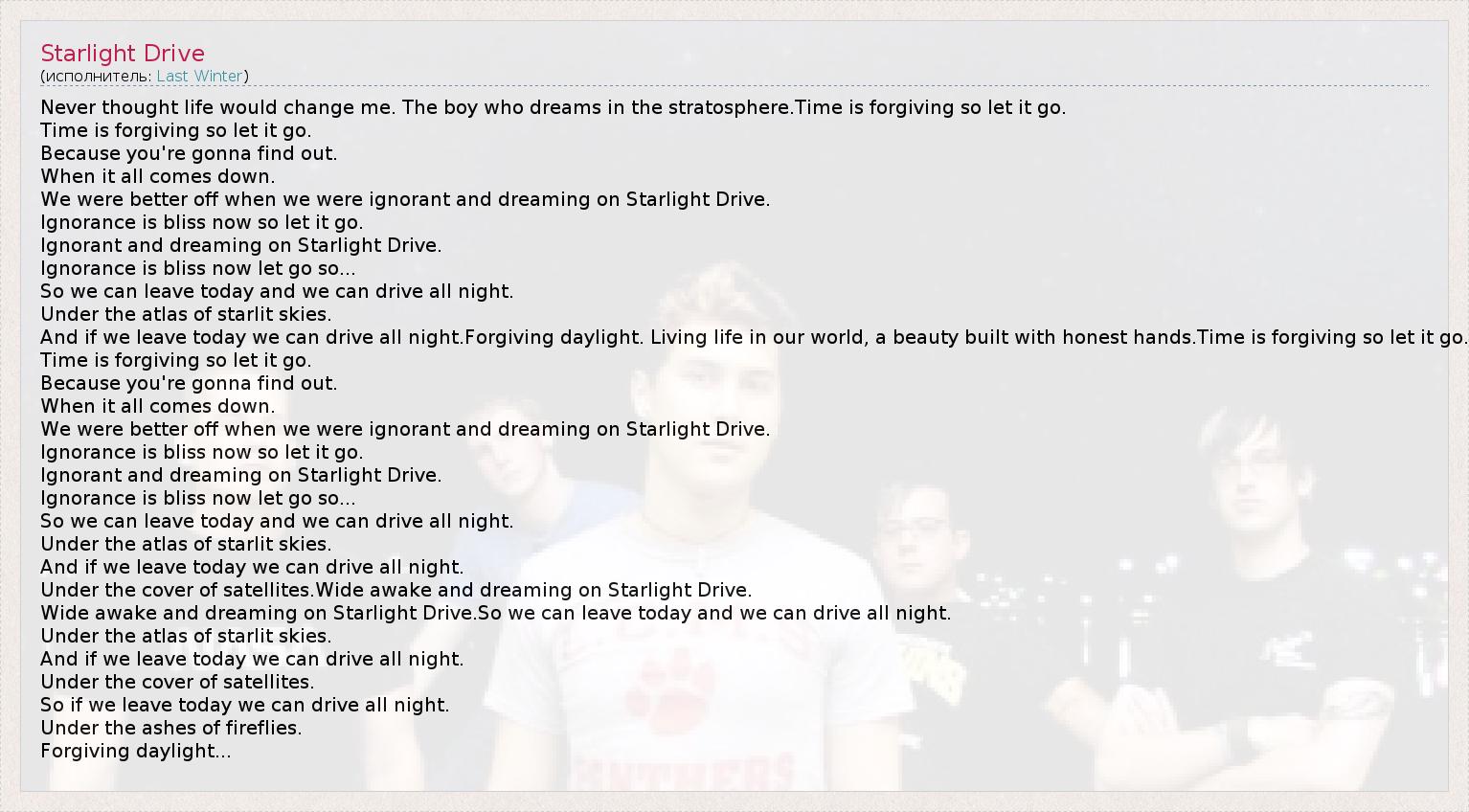 Never thought life would change me. The boy who dreams in the stratosphere.Time is forgiving so let it go. Time is forgiving so let it go. Because you're gonna find out. When it all comes down. We were better off when we were ignorant and dreaming on Starlight Drive. Ignorance is bliss now so let it go. Ignorant and dreaming on Starlight Drive. Ignorance is bliss now let go so... So we can leave today and we can drive all night. Under the atlas of starlit skies. And if we leave today we can drive all night.Forgiving daylight. Living life in our world, a beauty built with honest hands.Time is forgiving so let it go. Time is forgiving so let it go. Because you're gonna find out. When it all comes down. We were better off when we were ignorant and dreaming on Starlight Drive. Ignorance is bliss now so let it go. Ignorant and dreaming on Starlight Drive. Ignorance is bliss now let go so... So we can leave today and we can drive all night. Under the atlas of starlit skies. And if we leave today we can drive all night. Under the cover of satellites.Wide awake and dreaming on Starlight Drive. Wide awake and dreaming on Starlight Drive.So we can leave today and we can drive all night. Under the atlas of starlit skies. And if we leave today we can drive all night. Under the cover of satellites. So if we leave today we can drive all night. Under the ashes of fireflies. Forgiving daylight...