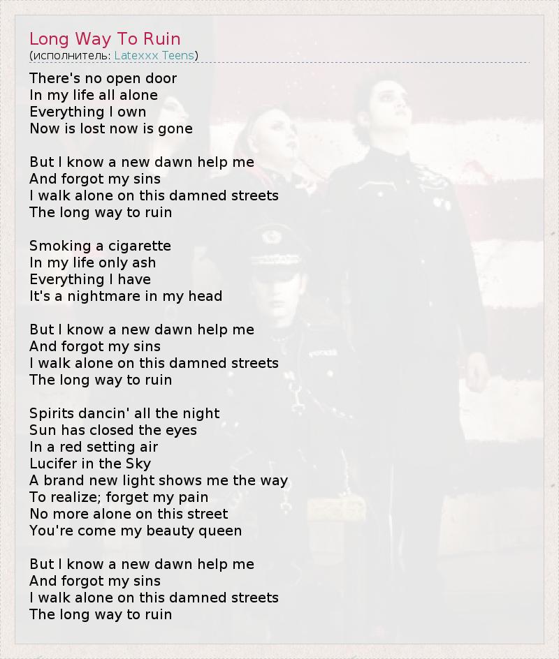 There's no open door In my life all alone Everything I own Now is lost now is gone But I know a new dawn help me And forgot my sins I walk alone on this damned streets The long way to ruin Smoking a cigarette In my life only ash Everything I have It's a nightmare in my head But I know a new dawn help me And forgot my sins I walk alone on this damned streets The long way to ruin Spirits dancin' all the night Sun has closed the eyes In a red setting air Lucifer in the Sky A brand new light shows me the way To realize; forget my pain No more alone on this street You're come my beauty queen But I know a new dawn help me And forgot my sins I walk alone on this damned streets The long way to ruin