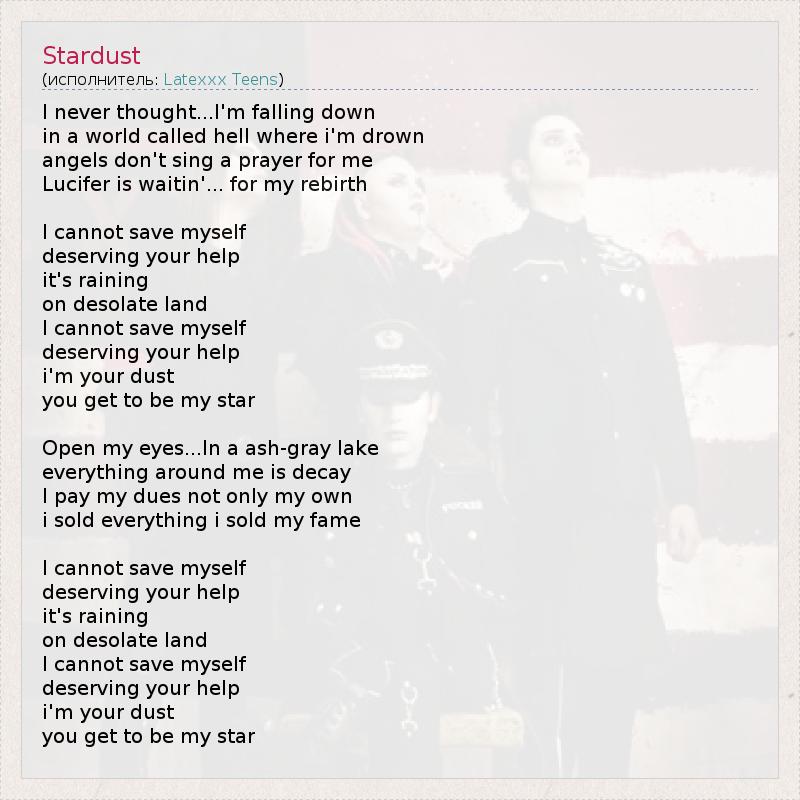 I never thought...I'm falling down in a world called hell where i'm drown angels don't sing a prayer for me Lucifer is waitin'... for my rebirth I cannot save myself deserving your help it's raining on desolate land I cannot save myself deserving your help i'm your dust you get to be my star Open my eyes...In a ash-gray lake everything around me is decay I pay my dues not only my own i sold everything i sold my fame I cannot save myself deserving your help it's raining on desolate land I cannot save myself deserving your help i'm your dust you get to be my star