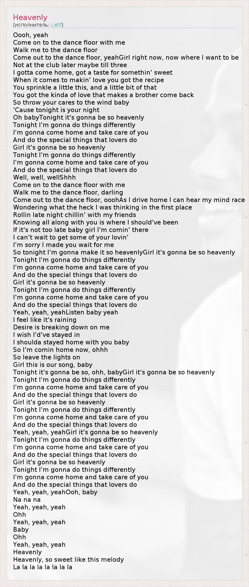 Oooh, yeah Come on to the dance floor with me Walk me to the dance floor Come out to the dance floor, yeahGirl right now, now where I want to be Not at the club later maybe till three I gotta come home, got a taste for somethin' sweet When it comes to makin' love you got the recipe You sprinkle a little this, and a little bit of that You got the kinda of love that makes a brother come back So throw your cares to the wind baby 'Cause tonight is your night Oh babyTonight it's gonna be so heavenly Tonight I'm gonna do things differently I'm gonna come home and take care of you And do the special things that lovers do Girl it's gonna be so heavenly Tonight I'm gonna do things differently I'm gonna come home and take care of you And do the special things that lovers do Well, well, wellShhh Come on to the dance floor with me Walk me to the dance floor, darling Come out to the dance floor, ooohAs I drive home I can hear my mind race Wondering what the heck I was thinking in the first place Rollin late night chillin' with my friends Knowing all along with you is where I should've been If it's not too late baby girl I'm comin' there I can't wait to get some of your lovin' I'm sorry I made you wait for me So tonight I'm gonna make it so heavenlyGirl it's gonna be so heavenly Tonight I'm gonna do things differently I'm gonna come home and take care of you And do the special things that lovers do Girl it's gonna be so heavenly Tonight I'm gonna do things differently I'm gonna come home and take care of you And do the special things that lovers do Yeah, yeah, yeahListen baby yeah I feel like it's raining Desire is breaking down on me I wish I'd've stayed in I shoulda stayed home with you baby So I'm comin home now, ohhh So leave the lights on Girl this is our song, baby Tonight it's gonna be so, ohh, babyGirl it's gonna be so heavenly Tonight I'm gonna do things differently I'm gonna come home and take care of you And do the special things that lovers do Girl it's gonna be so heavenly Tonight I'm gonna do things differently I'm gonna come home and take care of you And do the special things that lovers do Yeah, yeah, yeahGirl it's gonna be so heavenly Tonight I'm gonna do things differently I'm gonna come home and take care of you And do the special things that lovers do Girl it's gonna be so heavenly Tonight I'm gonna do things differently I'm gonna come home and take care of you And do the special things that lovers do Yeah, yeah, yeahOoh, baby Na na na Yeah, yeah, yeah Ohh Yeah, yeah, yeah Baby Ohh Yeah, yeah, yeah Heavenly Heavenly, so sweet like this melody La la la la la la la la