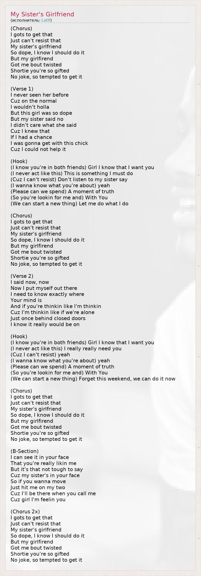 (Chorus) I gots to get that Just can't resist that My sister's girlfriend So dope, I know I should do it But my girlfirend Got me bout twisted Shortie you're so gifted No joke, so tempted to get it (Verse 1) I never seen her before Cuz on the normal I wouldn't holla But this girl was so dope But my sister said no I didn't care what she said Cuz I knew that If I had a chance I was gonna get with this chick Cuz I could not help it (Hook) (I know you're in both friends) Girl I know that I want you (I never act like this) This is something I must do (Cuz I can't resist) Don't listen to my sister say (I wanna know what you're about) yeah (Please can we spend) A moment of truth (So you're lookin for me and) With You (We can start a new thing) Let me do what I do (Chorus) I gots to get that Just can't resist that My sister's girlfriend So dope, I know I should do it But my girlfirend Got me bout twisted Shortie you're so gifted No joke, so tempted to get it (Verse 2) I said now, now Now I put myself out there I need to know exactly where Your mind is And if you're thinkin like I'm thinkin Cuz I'm thinkin like if we're alone Just once behind closed doors I know it really would be on (Hook) (I know you're in both friends) Girl I know that I want you (I never act like this) I really really need you (Cuz I can't resist) yeah (I wanna know what you're about) yeah (Please can we spend) A moment of truth (So you're lookin for me and) With You (We can start a new thing) Forget this weekend, we can do it now (Chorus) I gots to get that Just can't resist that My sister's girlfriend So dope, I know I should do it But my girlfirend Got me bout twisted Shortie you're so gifted No joke, so tempted to get it (B-Section) I can see it in your face That you're really likin me But it's that not tough to say Cuz my sister's in your face So if you wanna move Just hit me on my two Cuz I'll be there when you call me Cuz girl I'm feelin you (Chorus 2x) I gots to get that Just can't resist that My sister's girlfriend So dope, I know I should do it But my girlfirend Got me bout twisted Shortie you're so gifted No joke, so tempted to get it