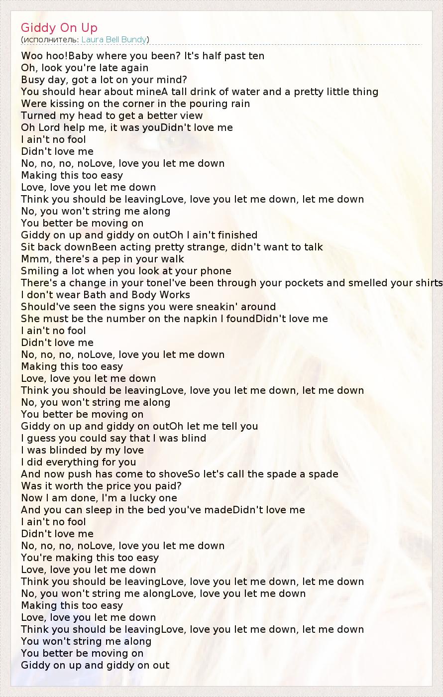 Woo hoo!Baby where you been? It's half past ten Oh, look you're late again Busy day, got a lot on your mind? You should hear about mineA tall drink of water and a pretty little thing Were kissing on the corner in the pouring rain Turned my head to get a better view Oh Lord help me, it was youDidn't love me I ain't no fool Didn't love me No, no, no, noLove, love you let me down Making this too easy Love, love you let me down Think you should be leavingLove, love you let me down, let me down No, you won't string me along You better be moving on Giddy on up and giddy on outOh I ain't finished Sit back downBeen acting pretty strange, didn't want to talk Mmm, there's a pep in your walk Smiling a lot when you look at your phone There's a change in your toneI've been through your pockets and smelled your shirts I don't wear Bath and Body Works Should've seen the signs you were sneakin' around She must be the number on the napkin I foundDidn't love me I ain't no fool Didn't love me No, no, no, noLove, love you let me down Making this too easy Love, love you let me down Think you should be leavingLove, love you let me down, let me down No, you won't string me along You better be moving on Giddy on up and giddy on outOh let me tell you I guess you could say that I was blind I was blinded by my love I did everything for you And now push has come to shoveSo let's call the spade a spade Was it worth the price you paid? Now I am done, I'm a lucky one And you can sleep in the bed you've madeDidn't love me I ain't no fool Didn't love me No, no, no, noLove, love you let me down You're making this too easy Love, love you let me down Think you should be leavingLove, love you let me down, let me down No, you won't string me alongLove, love you let me down Making this too easy Love, love you let me down Think you should be leavingLove, love you let me down, let me down You won't string me along You better be moving on Giddy on up and giddy on out