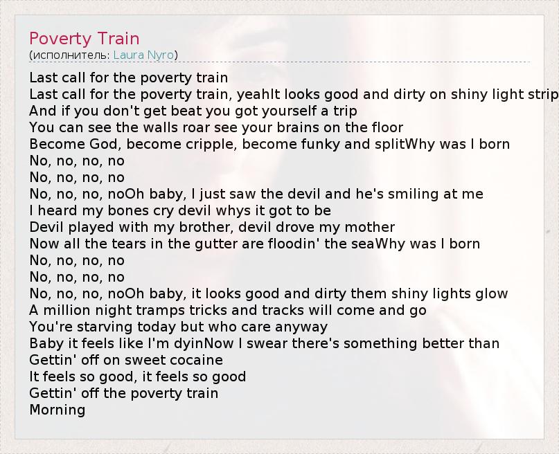 Last call for the poverty train Last call for the poverty train, yeahIt looks good and dirty on shiny light strip And if you don't get beat you got yourself a trip You can see the walls roar see your brains on the floor Become God, become cripple, become funky and splitWhy was I born No, no, no, no No, no, no, no No, no, no, noOh baby, I just saw the devil and he's smiling at me I heard my bones cry devil whys it got to be Devil played with my brother, devil drove my mother Now all the tears in the gutter are floodin' the seaWhy was I born No, no, no, no No, no, no, no No, no, no, noOh baby, it looks good and dirty them shiny lights glow A million night tramps tricks and tracks will come and go You're starving today but who care anyway Baby it feels like I'm dyinNow I swear there's something better than Gettin' off on sweet cocaine It feels so good, it feels so good Gettin' off the poverty train Morning