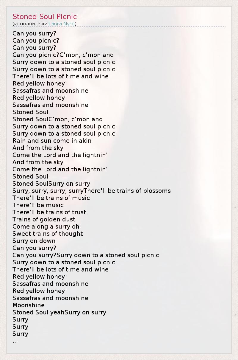 Can you surry? Can you picnic? Can you surry? Can you picnic?C'mon, c'mon and Surry down to a stoned soul picnic Surry down to a stoned soul picnic There'll be lots of time and wine Red yellow honey Sassafras and moonshine Red yellow honey Sassafras and moonshine Stoned Soul Stoned SoulC'mon, c'mon and Surry down to a stoned soul picnic Surry down to a stoned soul picnic Rain and sun come in akin And from the sky Come the Lord and the lightnin' And from the sky Come the Lord and the lightnin' Stoned Soul Stoned SoulSurry on surry Surry, surry, surry, surryThere'll be trains of blossoms There'll be trains of music There'll be music There'll be trains of trust Trains of golden dust Come along a surry oh Sweet trains of thought Surry on down Can you surry? Can you surry?Surry down to a stoned soul picnic Surry down to a stoned soul picnic There'll be lots of time and wine Red yellow honey Sassafras and moonshine Red yellow honey Sassafras and moonshine Moonshine Stoned Soul yeahSurry on surry Surry Surry Surry ...