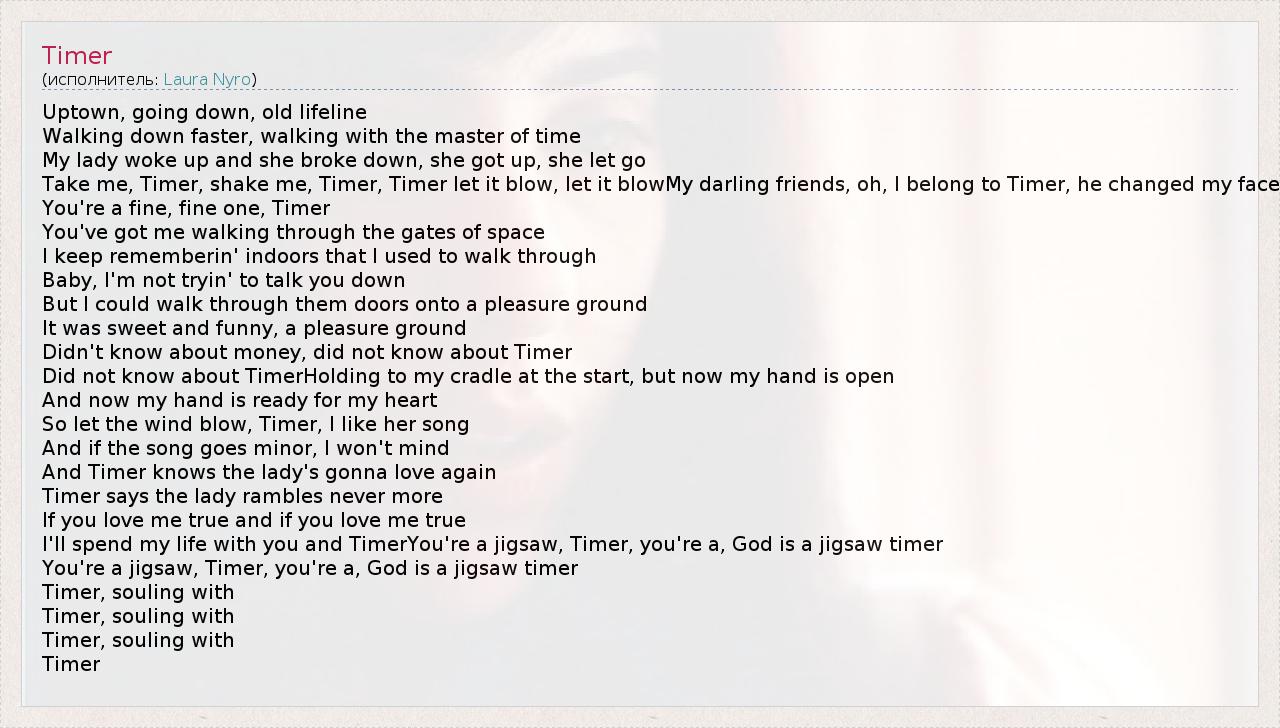 Uptown, going down, old lifeline Walking down faster, walking with the master of time My lady woke up and she broke down, she got up, she let go Take me, Timer, shake me, Timer, Timer let it blow, let it blowMy darling friends, oh, I belong to Timer, he changed my face You're a fine, fine one, Timer You've got me walking through the gates of space I keep rememberin' indoors that I used to walk through Baby, I'm not tryin' to talk you down But I could walk through them doors onto a pleasure ground It was sweet and funny, a pleasure ground Didn't know about money, did not know about Timer Did not know about TimerHolding to my cradle at the start, but now my hand is open And now my hand is ready for my heart So let the wind blow, Timer, I like her song And if the song goes minor, I won't mind And Timer knows the lady's gonna love again Timer says the lady rambles never more If you love me true and if you love me true I'll spend my life with you and TimerYou're a jigsaw, Timer, you're a, God is a jigsaw timer You're a jigsaw, Timer, you're a, God is a jigsaw timer Timer, souling with Timer, souling with Timer, souling with Timer