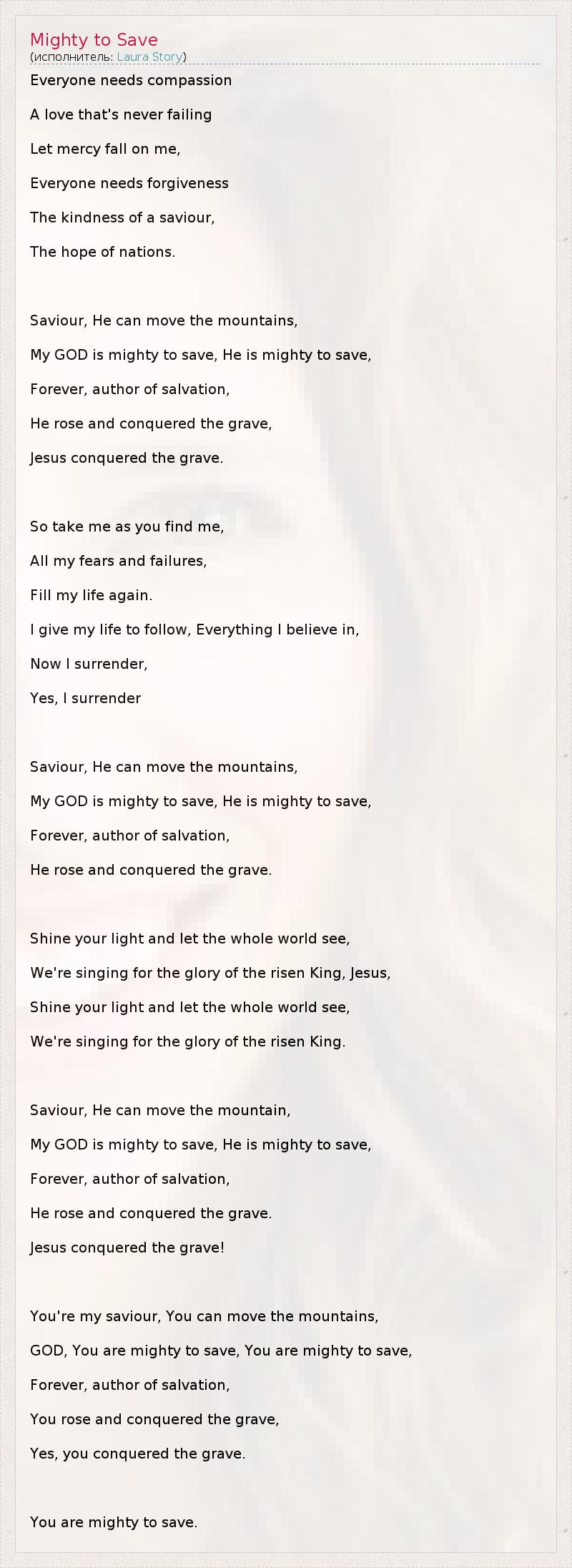 Everyone needs compassion A love that's never failing Let mercy fall on me, Everyone needs forgiveness The kindness of a saviour, The hope of nations. Saviour, He can move the mountains, My GOD is mighty to save, He is mighty to save, Forever, author of salvation, He rose and conquered the grave, Jesus conquered the grave. So take me as you find me, All my fears and failures, Fill my life again. I give my life to follow, Everything I believe in, Now I surrender, Yes, I surrender Saviour, He can move the mountains, My GOD is mighty to save, He is mighty to save, Forever, author of salvation, He rose and conquered the grave. Shine your light and let the whole world see, We're singing for the glory of the risen King, Jesus, Shine your light and let the whole world see, We're singing for the glory of the risen King. Saviour, He can move the mountain, My GOD is mighty to save, He is mighty to save, Forever, author of salvation, He rose and conquered the grave. Jesus conquered the grave! You're my saviour, You can move the mountains, GOD, You are mighty to save, You are mighty to save, Forever, author of salvation, You rose and conquered the grave, Yes, you conquered the grave. You are mighty to save.