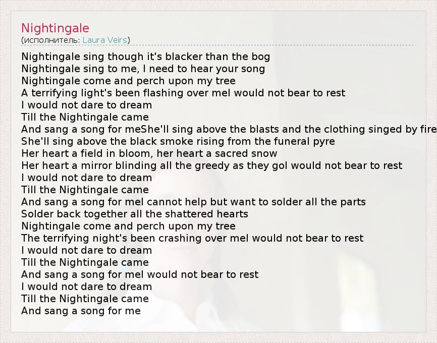 Nightingale sing though it's blacker than the bog Nightingale sing to me, I need to hear your song Nightingale come and perch upon my tree A terrifying light's been flashing over meI would not bear to rest I would not dare to dream Till the Nightingale came And sang a song for meShe'll sing above the blasts and the clothing singed by fire She'll sing above the black smoke rising from the funeral pyre Her heart a field in bloom, her heart a sacred snow Her heart a mirror blinding all the greedy as they goI would not bear to rest I would not dare to dream Till the Nightingale came And sang a song for meI cannot help but want to solder all the parts Solder back together all the shattered hearts Nightingale come and perch upon my tree The terrifying night's been crashing over meI would not bear to rest I would not dare to dream Till the Nightingale came And sang a song for meI would not bear to rest I would not dare to dream Till the Nightingale came And sang a song for me
