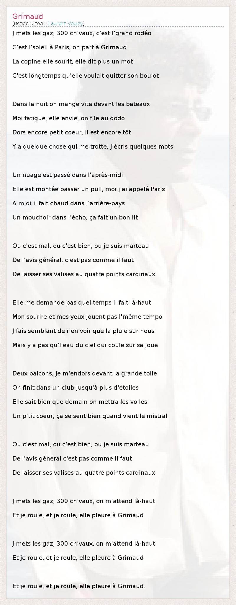 J'mets les gaz, 300 ch'vaux, c'est l'grand rodéo C'est l'soleil à Paris, on part à Grimaud La copine elle sourit, elle dit plus un mot C'est longtemps qu'elle voulait quitter son boulot Dans la nuit on mange vite devant les bateaux Moi fatigue, elle envie, on file au dodo Dors encore petit coeur, il est encore tôt Y a quelque chose qui me trotte, j'écris quelques mots Un nuage est passé dans l'après-midi Elle est montée passer un pull, moi j'ai appelé Paris A midi il fait chaud dans l'arrière-pays Un mouchoir dans l'écho, ça fait un bon lit Ou c'est mal, ou c'est bien, ou je suis marteau De l'avis général, c'est pas comme il faut De laisser ses valises au quatre points cardinaux Elle me demande pas quel temps il fait là-haut Mon sourire et mes yeux jouent pas l'même tempo J'fais semblant de rien voir que la pluie sur nous Mais y a pas qu'l'eau du ciel qui coule sur sa joue Deux balcons, je m'endors devant la grande toile On finit dans un club jusqu'à plus d'étoiles Elle sait bien que demain on mettra les voiles Un p'tit coeur, ça se sent bien quand vient le mistral Ou c'est mal, ou c'est bien, ou je suis marteau De l'avis général c'est pas comme il faut De laisser ses valises au quatre points cardinaux J'mets les gaz, 300 ch'vaux, on m'attend là-haut Et je roule, et je roule, elle pleure à Grimaud J'mets les gaz, 300 ch'vaux, on m'attend là-haut Et je roule, et je roule, elle pleure à Grimaud Et je roule, et je roule, elle pleure à Grimaud.