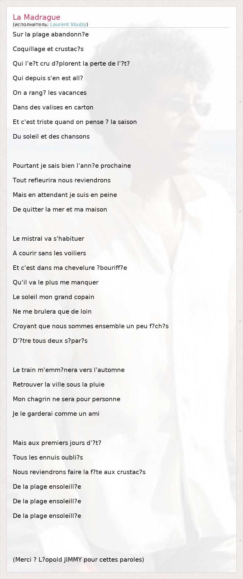 Sur la plage abandonn?e Coquillage et crustac?s Qui l'e?t cru d?plorent la perte de l'?t? Qui depuis s'en est all? On a rang? les vacances Dans des valises en carton Et c'est triste quand on pense ? la saison Du soleil et des chansons Pourtant je sais bien l'ann?e prochaine Tout refleurira nous reviendrons Mais en attendant je suis en peine De quitter la mer et ma maison Le mistral va s'habituer A courir sans les voiliers Et c'est dans ma chevelure ?bouriff?e Qu'il va le plus me manquer Le soleil mon grand copain Ne me brulera que de loin Croyant que nous sommes ensemble un peu f?ch?s D'?tre tous deux s?par?s Le train m'emm?nera vers l'automne Retrouver la ville sous la pluie Mon chagrin ne sera pour personne Je le garderai comme un ami Mais aux premiers jours d'?t? Tous les ennuis oubli?s Nous reviendrons faire la f?te aux crustac?s De la plage ensoleill?e De la plage ensoleill?e De la plage ensoleill?e (Merci ? L?opold JIMMY pour cettes paroles)
