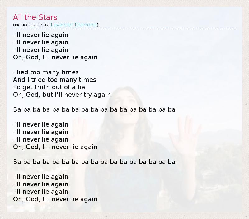 Я больше никогда не буду врать, Я больше никогда не буду врать, Я больше никогда не буду врать, О, Боже, я больше никогда не буду врать Я лгала слишком много раз, И я пыталась слишком много раз Получить правду из лжи, О, Боже, но я больше никогда не буду пытаться Ба ба ба ба ба ба ба ба ба ба ба ба ба ба ба ба ба Я больше никогда не буду врать, Я больше никогда не буду врать, Я больше никогда не буду врать, О, Боже, я никогда больше не буду врать Ба ба ба ба ба ба ба ба ба ба ба ба ба ба ба ба ба Я больше никогда не буду врать, Я больше никогда не буду врать, Я больше никогда не буду врать, О, Боже, я больше никогда не буду врать