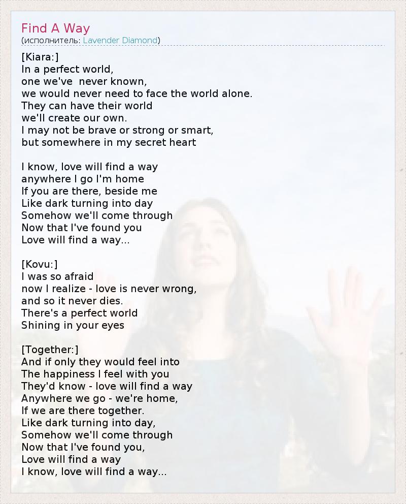 [Kiara:] In a perfect world, one we've never known, we would never need to face the world alone. They can have their world we'll create our own. I may not be brave or strong or smart, but somewhere in my secret heart I know, love will find a way anywhere I go I'm home If you are there, beside me Like dark turning into day Somehow we'll come through Now that I've found you Love will find a way... [Kovu:] I was so afraid now I realize - love is never wrong, and so it never dies. There's a perfect world Shining in your eyes [Together:] And if only they would feel into The happiness I feel with you They'd know - love will find a way Anywhere we go - we're home, If we are there together. Like dark turning into day, Somehow we'll come through Now that I've found you, Love will find a way I know, love will find a way...