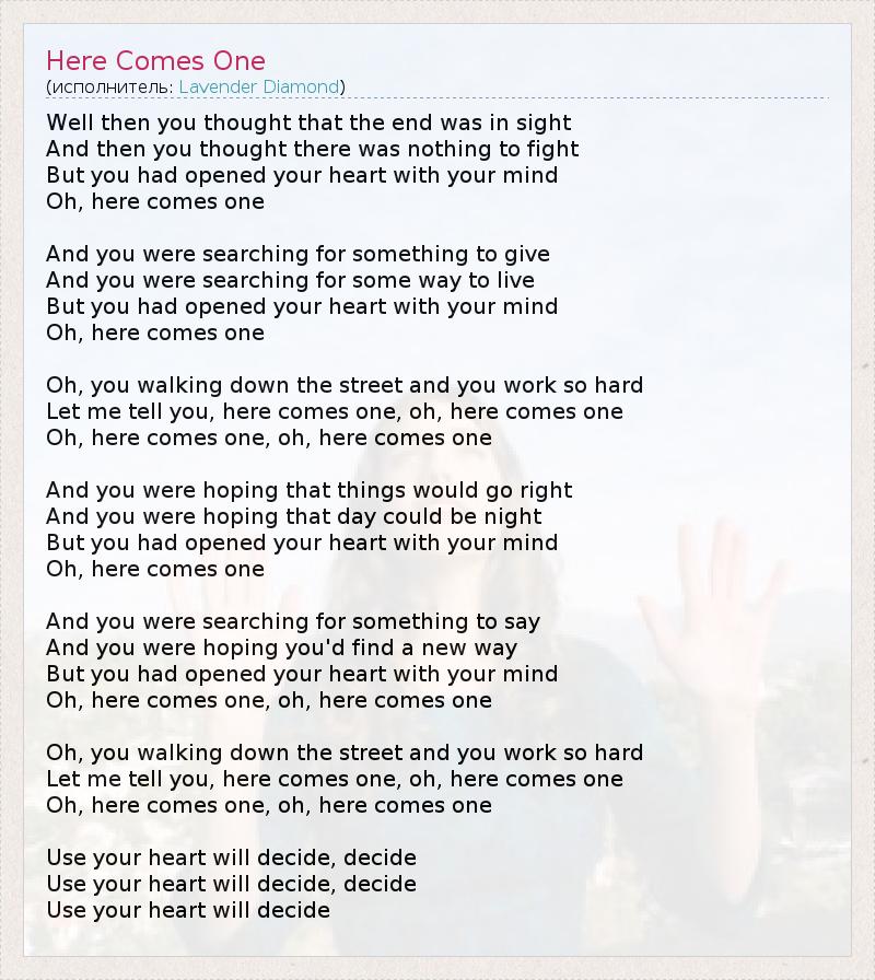 Well then you thought that the end was in sight And then you thought there was nothing to fight But you had opened your heart with your mind Oh, here comes one And you were searching for something to give And you were searching for some way to live But you had opened your heart with your mind Oh, here comes one Oh, you walking down the street and you work so hard Let me tell you, here comes one, oh, here comes one Oh, here comes one, oh, here comes one And you were hoping that things would go right And you were hoping that day could be night But you had opened your heart with your mind Oh, here comes one And you were searching for something to say And you were hoping you'd find a new way But you had opened your heart with your mind Oh, here comes one, oh, here comes one Oh, you walking down the street and you work so hard Let me tell you, here comes one, oh, here comes one Oh, here comes one, oh, here comes one Use your heart will decide, decide Use your heart will decide, decide Use your heart will decide