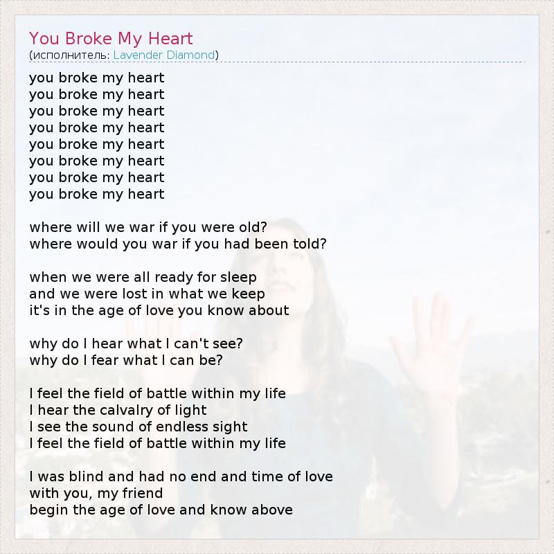 you broke my heart you broke my heart you broke my heart you broke my heart you broke my heart you broke my heart you broke my heart you broke my heart where will we war if you were old? where would you war if you had been told? when we were all ready for sleep and we were lost in what we keep it's in the age of love you know about why do I hear what I can't see? why do I fear what I can be? I feel the field of battle within my life I hear the calvalry of light I see the sound of endless sight I feel the field of battle within my life I was blind and had no end and time of love with you, my friend begin the age of love and know above
