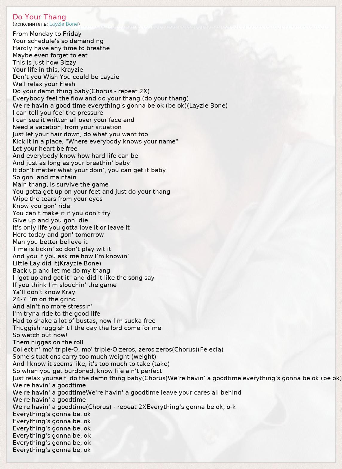 From Monday to Friday Your schedule's so demanding Hardly have any time to breathe Maybe even forget to eat This is just how Bizzy Your life in this, Krayzie Don't you Wish You could be Layzie Well relax your Flesh Do your damn thing baby(Chorus - repeat 2X) Everybody feel the flow and do your thang (do your thang) We're havin a good time everything's gonna be ok (be ok)(Layzie Bone) I can tell you feel the pressure I can see it written all over your face and Need a vacation, from your situation Just let your hair down, do what you want too Kick it in a place, "Where everybody knows your name" Let your heart be free And everybody know how hard life can be And just as long as your breathin' baby It don't matter what your doin', you can get it baby So gon' and maintain Main thang, is survive the game You gotta get up on your feet and just do your thang Wipe the tears from your eyes Know you gon' ride You can't make it if you don't try Give up and you gon' die It's only life you gotta love it or leave it Here today and gon' tomorrow Man you better believe it Time is tickin' so don't play wit it And you if you ask me how I'm knowin' Little Lay did it(Krayzie Bone) Back up and let me do my thang I "got up and got it" and did it like the song say If you think I'm slouchin' the game Ya'll don't know Kray 24-7 I'm on the grind And ain't no more stressin' I'm tryna ride to the good life Had to shake a lot of bustas, now I'm sucka-free Thuggish ruggish til the day the lord come for me So watch out now! Them niggas on the roll Collectin' mo' triple-O, mo' triple-O zeros, zeros zeros(Chorus)(Felecia) Some situations carry too much weight (weight) And I know it seems like, it's too much to take (take) So when you get burdoned, know life ain't perfect Just relax yourself, do the damn thing baby(Chorus)We're havin' a goodtime everything's gonna be ok (be ok) We're havin' a goodtime We're havin' a goodtimeWe're havin' a goodtime leave your cares all behind We're havin' a goodtime We're havin' a goodtime(Chorus) - repeat 2XEverything's gonna be ok, o-k Everything's gonna be, ok Everything's gonna be, ok Everything's gonna be, ok Everything's gonna be, ok Everything's gonna be, ok Everything's gonna be, ok