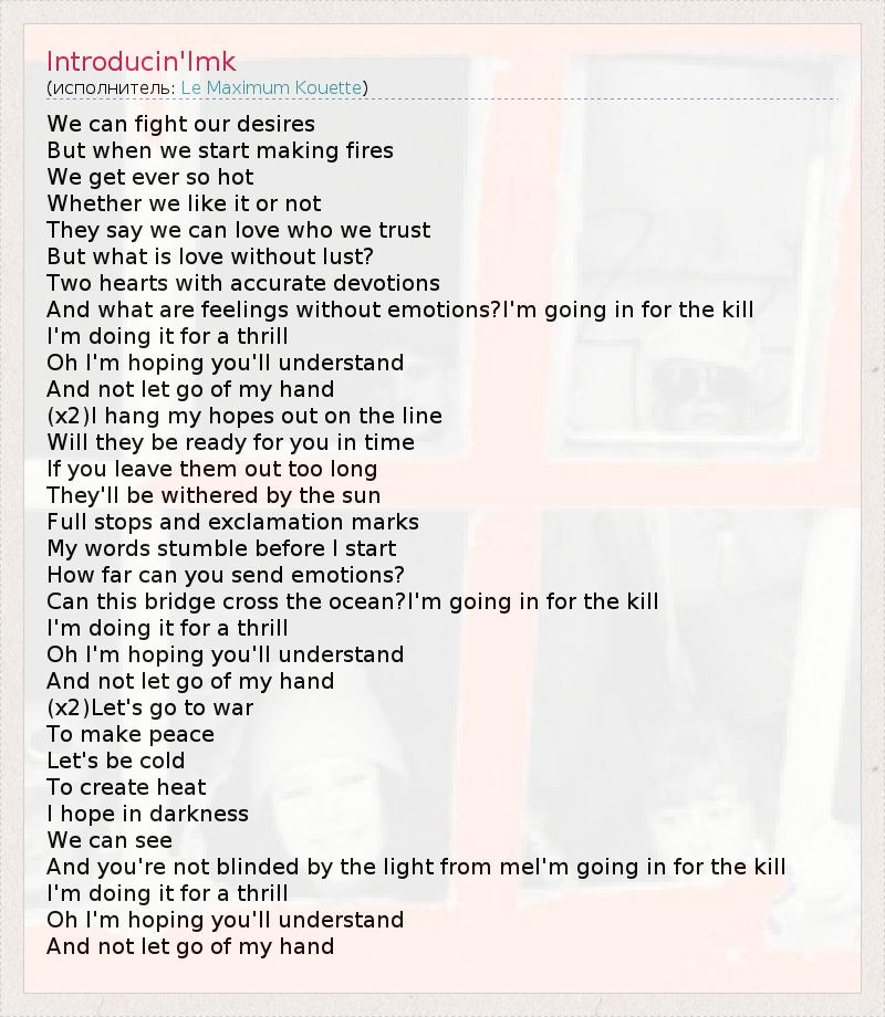 We can fight our desires But when we start making fires We get ever so hot Whether we like it or not They say we can love who we trust But what is love without lust? Two hearts with accurate devotions And what are feelings without emotions?I'm going in for the kill I'm doing it for a thrill Oh I'm hoping you'll understand And not let go of my hand (x2)I hang my hopes out on the line Will they be ready for you in time If you leave them out too long They'll be withered by the sun Full stops and exclamation marks My words stumble before I start How far can you send emotions? Can this bridge cross the ocean?I'm going in for the kill I'm doing it for a thrill Oh I'm hoping you'll understand And not let go of my hand (x2)Let's go to war To make peace Let's be cold To create heat I hope in darkness We can see And you're not blinded by the light from meI'm going in for the kill I'm doing it for a thrill Oh I'm hoping you'll understand And not let go of my hand