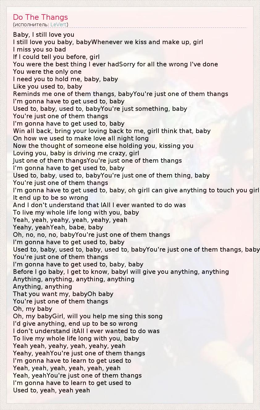 Baby, I still love you I still love you baby, babyWhenever we kiss and make up, girl I miss you so bad If I could tell you before, girl You were the best thing I ever hadSorry for all the wrong I've done You were the only one I need you to hold me, baby, baby Like you used to, baby Reminds me one of them thangs, babyYou're just one of them thangs I'm gonna have to get used to, baby Used to, baby, used to, babyYou're just something, baby You're just one of them thangs I'm gonna have to get used to, baby Win all back, bring your loving back to me, girlI think that, baby On how we used to make love all night long Now the thought of someone else holding you, kissing you Loving you, baby is driving me crazy, girl Just one of them thangsYou're just one of them thangs I'm gonna have to get used to, baby Used to, baby, used to, babyYou're just one of them thing, baby You're just one of them thangs I'm gonna have to get used to, baby, oh girlI can give anything to touch you girl It end up to be so wrong And I don't understand that IAll I ever wanted to do was To live my whole life long with you, baby Yeah, yeah, yeahy, yeah, yeahy, yeah Yeahy, yeahYeah, babe, baby Oh, no, no, no, babyYou're just one of them thangs I'm gonna have to get used to, baby Used to, baby, used to, baby, used to, babyYou're just one of them thangs, baby You're just one of them thangs I'm gonna have to get used to, baby, baby Before I go baby, I get to know, babyI will give you anything, anything Anything, anything, anything, anything Anything, anything That you want my, babyOh baby You're just one of them thangs Oh, my baby Oh, my babyGirl, will you help me sing this song I'd give anything, end up to be so wrong I don't understand itAll I ever wanted to do was To live my whole life long with you, baby Yeah yeah, yeahy, yeah, yeahy, yeah Yeahy, yeahYou're just one of them thangs I'm gonna have to learn to get used to Yeah, yeah, yeah, yeah, yeah, yeah Yeah, yeahYou're just one of them thangs I'm gonna have to learn to get used to Used to, yeah, yeah yeah