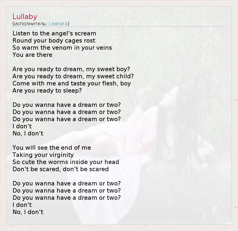 Listen to the angel's scream Round your body cages rost So warm the venom in your veins You are there Are you ready to dream, my sweet boy? Are you ready to dream, my sweet child? Come with me and taste your flesh, boy Are you ready to sleep? Do you wanna have a dream or two? Do you wanna have a dream or two? Do you wanna have a dream or two? I don't No, I don't You will see the end of me Taking your virginity So cute the worms inside your head Don't be scared, don't be scared Do you wanna have a dream or two? Do you wanna have a dream or two? Do you wanna have a dream or two? I don't No, I don't