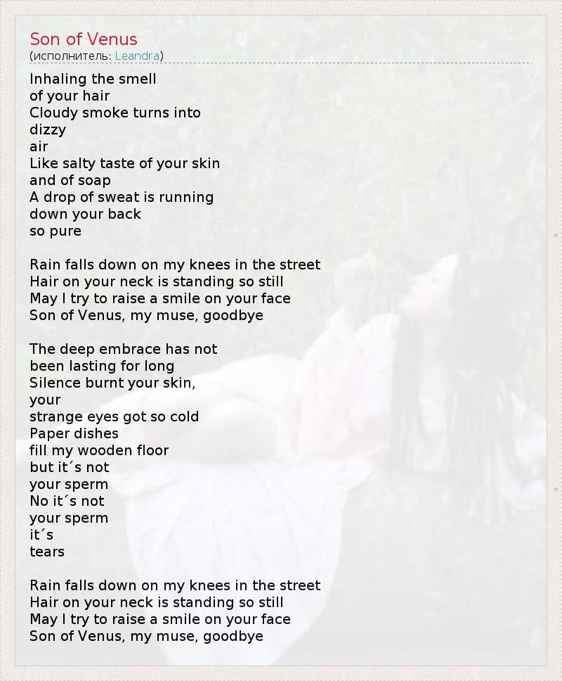 Inhaling the smell of your hair Cloudy smoke turns into dizzy air Like salty taste of your skin and of soap A drop of sweat is running down your back so pure Rain falls down on my knees in the street Hair on your neck is standing so still May I try to raise a smile on your face Son of Venus, my muse, goodbye The deep embrace has not been lasting for long Silence burnt your skin, your strange eyes got so cold Paper dishes fill my wooden floor but it´s not your sperm No it´s not your sperm it´s tears Rain falls down on my knees in the street Hair on your neck is standing so still May I try to raise a smile on your face Son of Venus, my muse, goodbye