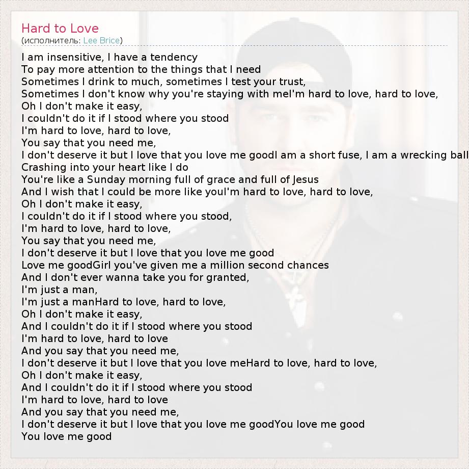 I am insensitive, I have a tendency To pay more attention to the things that I need Sometimes I drink to much, sometimes I test your trust, Sometimes I don't know why you're staying with meI'm hard to love, hard to love, Oh I don't make it easy, I couldn't do it if I stood where you stood I'm hard to love, hard to love, You say that you need me, I don't deserve it but I love that you love me goodI am a short fuse, I am a wrecking ball Crashing into your heart like I do You're like a Sunday morning full of grace and full of Jesus And I wish that I could be more like youI'm hard to love, hard to love, Oh I don't make it easy, I couldn't do it if I stood where you stood, I'm hard to love, hard to love, You say that you need me, I don't deserve it but I love that you love me good Love me goodGirl you've given me a million second chances And I don't ever wanna take you for granted, I'm just a man, I'm just a manHard to love, hard to love, Oh I don't make it easy, And I couldn't do it if I stood where you stood I'm hard to love, hard to love And you say that you need me, I don't deserve it but I love that you love meHard to love, hard to love, Oh I don't make it easy, And I couldn't do it if I stood where you stood I'm hard to love, hard to love And you say that you need me, I don't deserve it but I love that you love me goodYou love me good You love me good