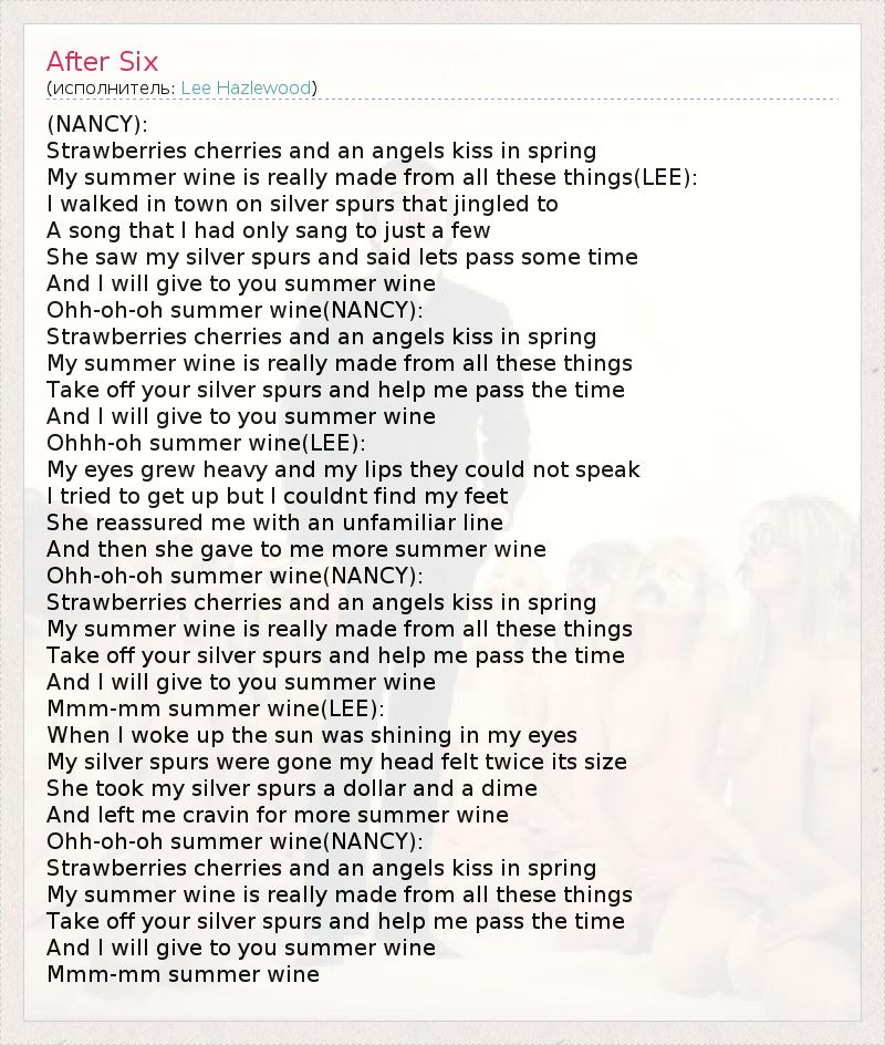 (NANCY): Strawberries cherries and an angels kiss in spring My summer wine is really made from all these things(LEE): I walked in town on silver spurs that jingled to A song that I had only sang to just a few She saw my silver spurs and said lets pass some time And I will give to you summer wine Ohh-oh-oh summer wine(NANCY): Strawberries cherries and an angels kiss in spring My summer wine is really made from all these things Take off your silver spurs and help me pass the time And I will give to you summer wine Ohhh-oh summer wine(LEE): My eyes grew heavy and my lips they could not speak I tried to get up but I couldnt find my feet She reassured me with an unfamiliar line And then she gave to me more summer wine Ohh-oh-oh summer wine(NANCY): Strawberries cherries and an angels kiss in spring My summer wine is really made from all these things Take off your silver spurs and help me pass the time And I will give to you summer wine Mmm-mm summer wine(LEE): When I woke up the sun was shining in my eyes My silver spurs were gone my head felt twice its size She took my silver spurs a dollar and a dime And left me cravin for more summer wine Ohh-oh-oh summer wine(NANCY): Strawberries cherries and an angels kiss in spring My summer wine is really made from all these things Take off your silver spurs and help me pass the time And I will give to you summer wine Mmm-mm summer wine