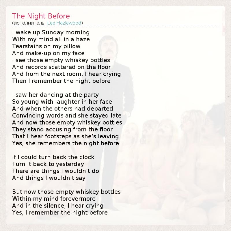 I wake up Sunday morning With my mind all in a haze Tearstains on my pillow And make-up on my face I see those empty whiskey bottles And records scattered on the floor And from the next room, I hear crying Then I remember the night before I saw her dancing at the party So young with laughter in her face And when the others had departed Convincing words and she stayed late And now those empty whiskey bottles They stand accusing from the floor That I hear footsteps as she's leaving Yes, she remembers the night before If I could turn back the clock Turn it back to yesterday There are things I wouldn't do And things I wouldn't say But now those empty whiskey bottles Within my mind forevermore And in the silence, I hear crying Yes, I remember the night before