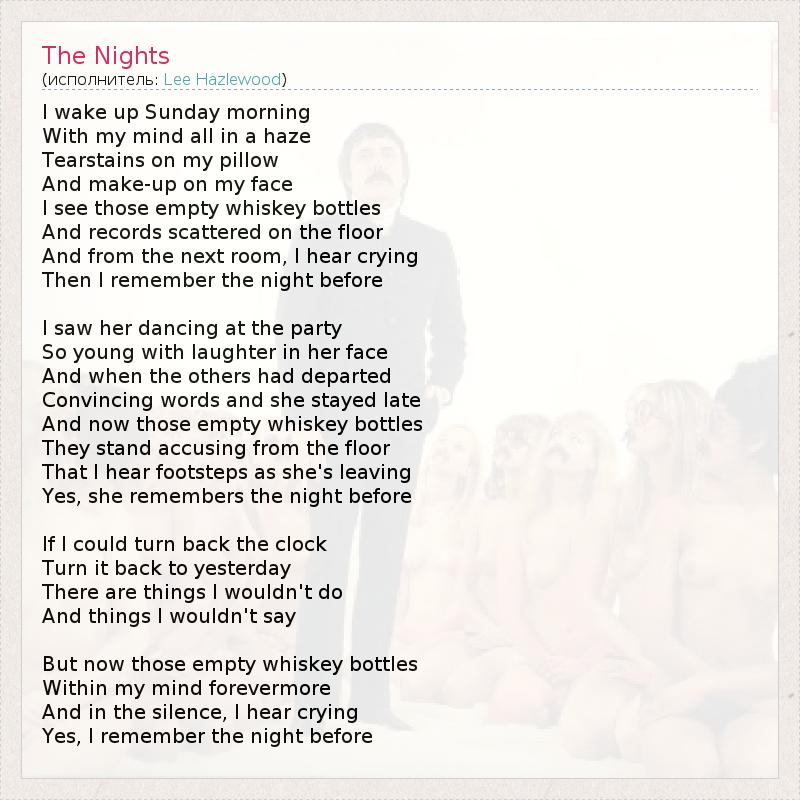 I wake up Sunday morning With my mind all in a haze Tearstains on my pillow And make-up on my face I see those empty whiskey bottles And records scattered on the floor And from the next room, I hear crying Then I remember the night before I saw her dancing at the party So young with laughter in her face And when the others had departed Convincing words and she stayed late And now those empty whiskey bottles They stand accusing from the floor That I hear footsteps as she's leaving Yes, she remembers the night before If I could turn back the clock Turn it back to yesterday There are things I wouldn't do And things I wouldn't say But now those empty whiskey bottles Within my mind forevermore And in the silence, I hear crying Yes, I remember the night before