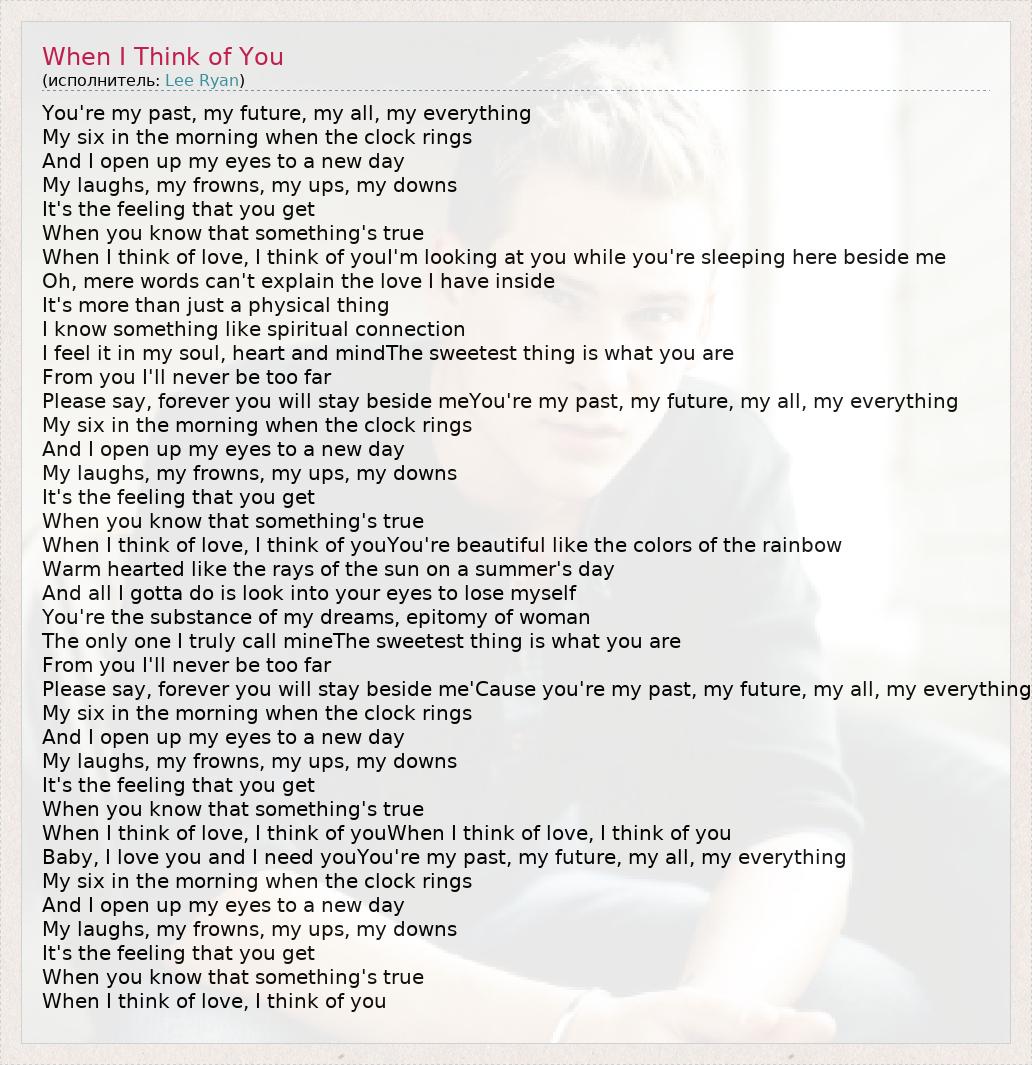You're my past, my future, my all, my everything My six in the morning when the clock rings And I open up my eyes to a new day My laughs, my frowns, my ups, my downs It's the feeling that you get When you know that something's true When I think of love, I think of youI'm looking at you while you're sleeping here beside me Oh, mere words can't explain the love I have inside It's more than just a physical thing I know something like spiritual connection I feel it in my soul, heart and mindThe sweetest thing is what you are From you I'll never be too far Please say, forever you will stay beside meYou're my past, my future, my all, my everything My six in the morning when the clock rings And I open up my eyes to a new day My laughs, my frowns, my ups, my downs It's the feeling that you get When you know that something's true When I think of love, I think of youYou're beautiful like the colors of the rainbow Warm hearted like the rays of the sun on a summer's day And all I gotta do is look into your eyes to lose myself You're the substance of my dreams, epitomy of woman The only one I truly call mineThe sweetest thing is what you are From you I'll never be too far Please say, forever you will stay beside me'Cause you're my past, my future, my all, my everything My six in the morning when the clock rings And I open up my eyes to a new day My laughs, my frowns, my ups, my downs It's the feeling that you get When you know that something's true When I think of love, I think of youWhen I think of love, I think of you Baby, I love you and I need youYou're my past, my future, my all, my everything My six in the morning when the clock rings And I open up my eyes to a new day My laughs, my frowns, my ups, my downs It's the feeling that you get When you know that something's true When I think of love, I think of you