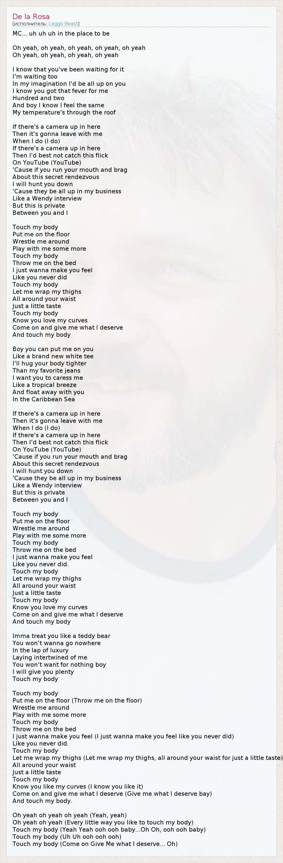 MC... uh uh uh in the place to be Oh yeah, oh yeah, oh yeah, oh yeah, oh yeah Oh yeah, oh yeah, oh yeah, oh yeah I know that you've been waiting for it I'm waiting too In my imagination I'd be all up on you I know you got that fever for me Hundred and two And boy I know I feel the same My temperature's through the roof If there's a camera up in here Then it's gonna leave with me When I do (I do) If there's a camera up in here Then I'd best not catch this flick On YouTube (YouTube) 'Cause if you run your mouth and brag About this secret rendezvous I will hunt you down 'Cause they be all up in my business Like a Wendy interview But this is private Between you and I Touch my body Put me on the floor Wrestle me around Play with me some more Touch my body Throw me on the bed I just wanna make you feel Like you never did Touch my body Let me wrap my thighs All around your waist Just a little taste Touch my body Know you love my curves Come on and give me what I deserve And touch my body Boy you can put me on you Like a brand new white tee I'll hug your body tighter Than my favorite jeans I want you to caress me Like a tropical breeze And float away with you In the Caribbean Sea If there's a camera up in here Then it's gonna leave with me When I do (I do) If there's a camera up in here Then I'd best not catch this flick On YouTube (YouTube) 'Cause if you run your mouth and brag About this secret rendezvous I will hunt you down 'Cause they be all up in my business Like a Wendy interview But this is private Between you and I Touch my body Put me on the floor Wrestle me around Play with me some more Touch my body Throw me on the bed I just wanna make you feel Like you never did. Touch my body Let me wrap my thighs All around your waist Just a little taste Touch my body Know you love my curves Come on and give me what I deserve And touch my body Imma treat you like a teddy bear You won't wanna go nowhere In the lap of luxury Laying intertwined of me You won't want for nothing boy I will give you plenty Touch my body Touch my body Put me on the floor (Throw me on the floor) Wrestle me around Play with me some more Touch my body Throw me on the bed I just wanna make you feel (I just wanna make you feel like you never did) Like you never did. Touch my body Let me wrap my thighs (Let me wrap my thighs, all around your waist for just a little taste) All around your waist Just a little taste Touch my body Know you like my curves (I know you like it) Come on and give me what I deserve (Give me what I deserve bay) And touch my body. Oh yeah oh yeah oh yeah (Yeah, yeah) Oh yeah oh yeah (Every little way you like to touch my body) Touch my body (Yeah Yeah ooh ooh baby...Oh Oh, ooh ooh baby) Touch my body (Uh Uh ooh ooh ooh) Touch my body (Come on Give Me what I deserve... Oh)