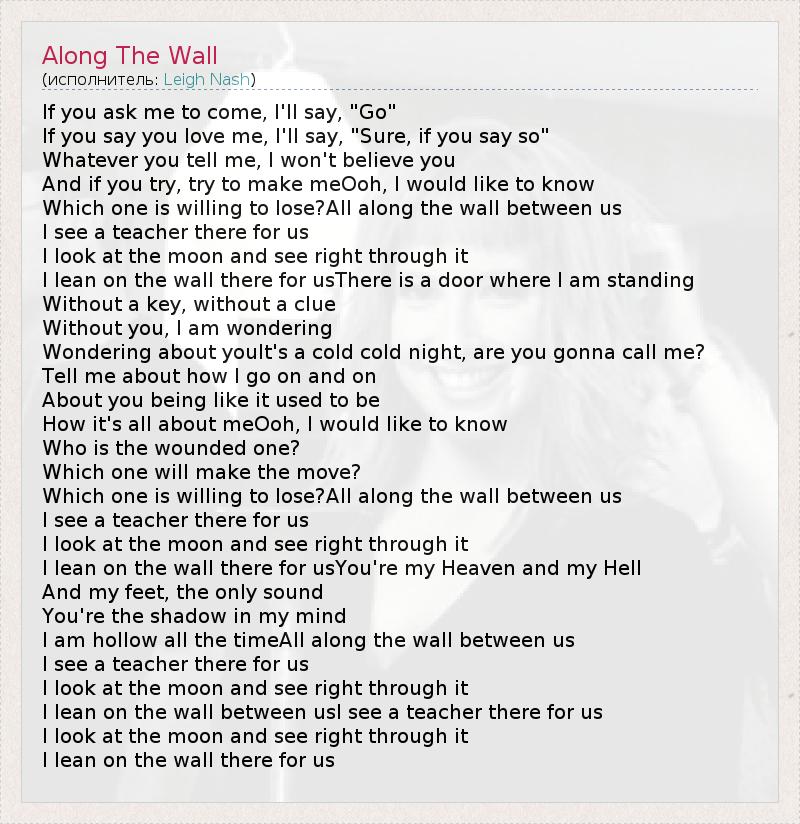 If you ask me to come, I'll say, "Go" If you say you love me, I'll say, "Sure, if you say so" Whatever you tell me, I won't believe you And if you try, try to make meOoh, I would like to know Which one is willing to lose?All along the wall between us I see a teacher there for us I look at the moon and see right through it I lean on the wall there for usThere is a door where I am standing Without a key, without a clue Without you, I am wondering Wondering about youIt's a cold cold night, are you gonna call me? Tell me about how I go on and on About you being like it used to be How it's all about meOoh, I would like to know Who is the wounded one? Which one will make the move? Which one is willing to lose?All along the wall between us I see a teacher there for us I look at the moon and see right through it I lean on the wall there for usYou're my Heaven and my Hell And my feet, the only sound You're the shadow in my mind I am hollow all the timeAll along the wall between us I see a teacher there for us I look at the moon and see right through it I lean on the wall between usI see a teacher there for us I look at the moon and see right through it I lean on the wall there for us